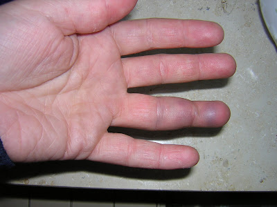 Keine fünf Minuten später kam der eine Hund wieder auf uns zu gerannt und das Frauchen sah es nicht als notwendig an sich mal zu beeilen. Eine Schnecke wäre schneller gewesen. Wie das so ist kam der Hund auch zielstrebig auf Askja zu und sie knurrte und der viel größere Hund fiel natürlich über meine Kleine her. Beim Versuch den großen Hund von meiner zu zerren – Askja fiepte schon arg – habe ich mir wohl den Ringfinger der linken Hand verbogen/gezerrt oder sonstwas. Dick ist er – schillert in allen Farben und tut weh. Da ich ihn noch im unteren Gelenk abknicken kann und auch das obere Glied mit Hilfe der rechten Hand umbiegen kann ohne das mir Tränen in die Augen schießen, meinten die zwei Mediziner bei mir – das wir nicht gebrochen sein, nur gezerrt…