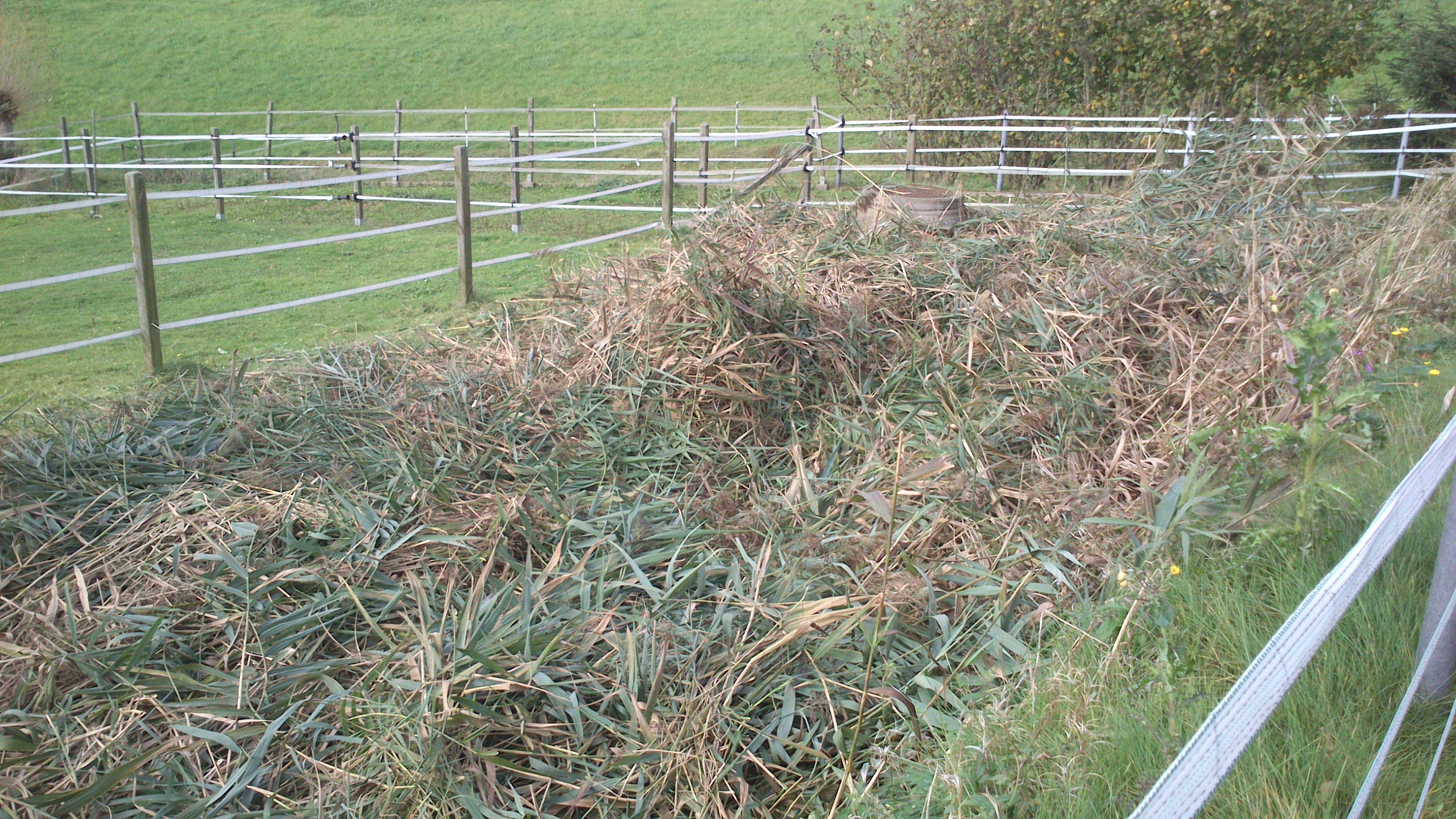 Nachdem der Wocheneinkauf morgens erledigt war, habe ich die Motorsense startklar gemacht und das Schilf flach gelegt. Und auch wieder schön gleichmäßig verteilt.