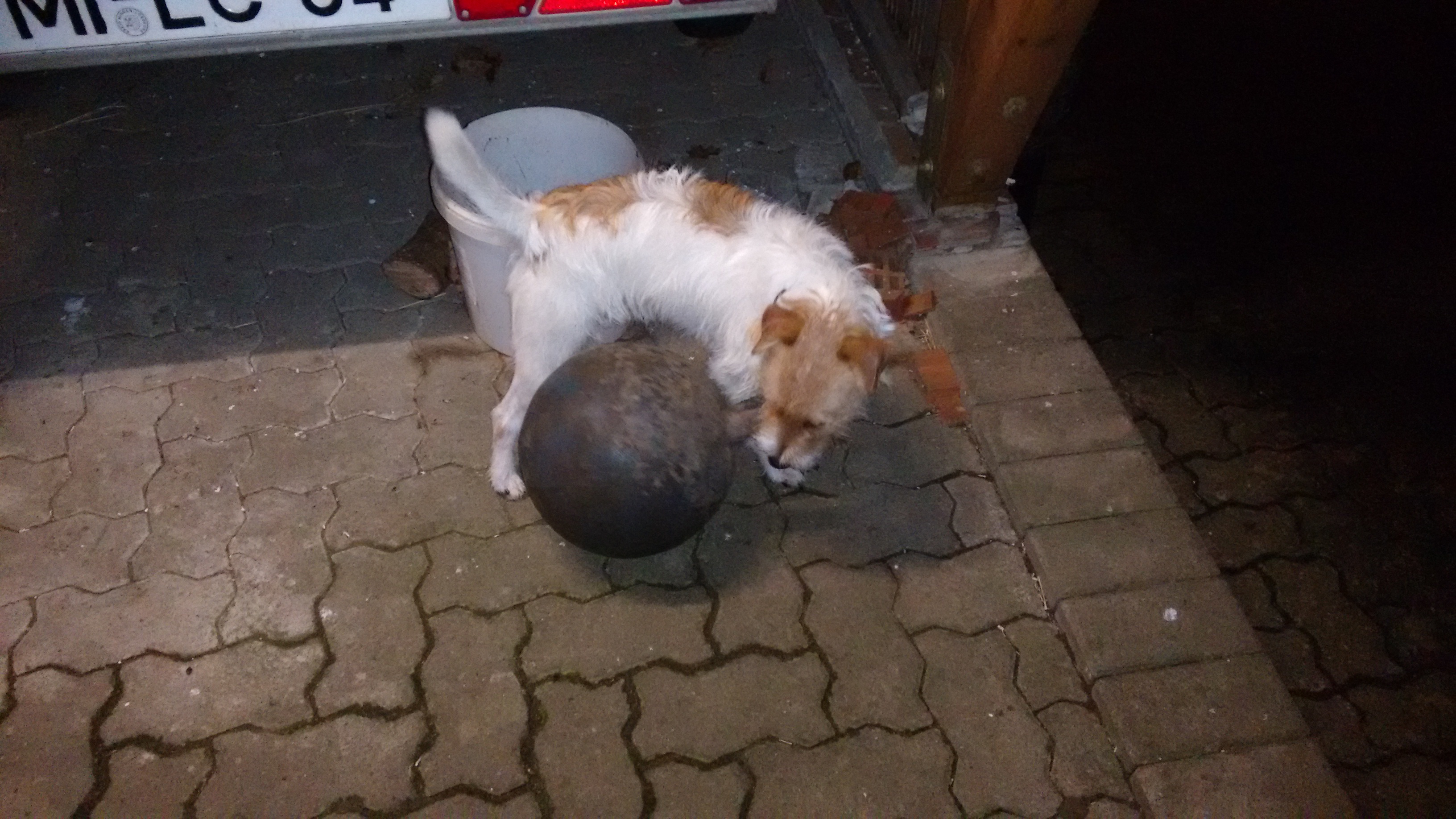 Ball wegwerfen und er bringt ihn wieder – das Spiel findet Deter klasse. und weil das Wetter heute Abend noch immer schlecht war, hat Dexter beschlossen „Draußen spielen ist doof“ und nahm seinen Ball wieder mit ins Haus.