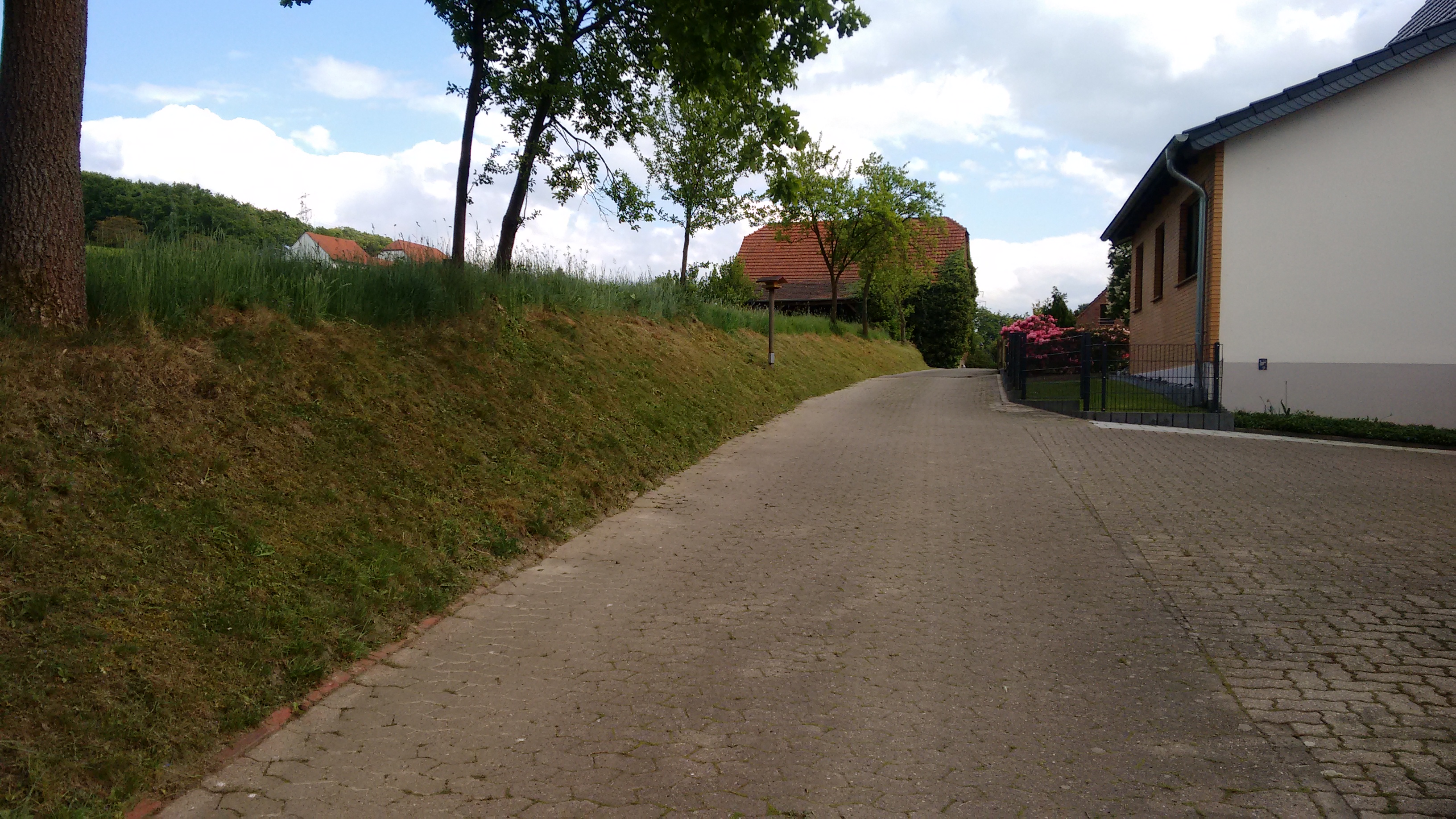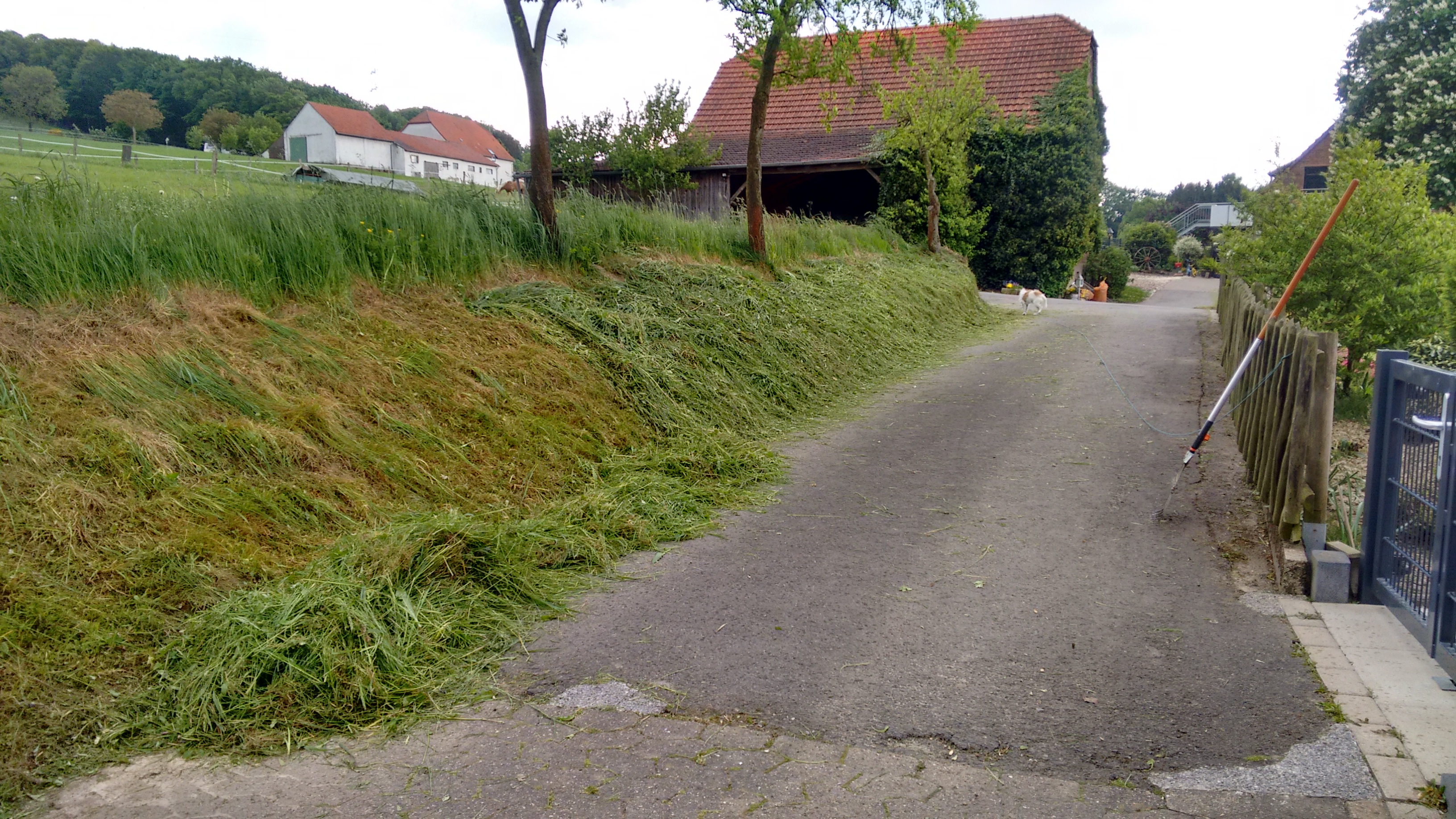 Die Zufahrt zu unserem Hof hat auf der einen Seite eine kleine Böschung. Und dort wächst das Gras leider genau so doll wie im Garten der Rasen. Nur mähen kann man die Böschung nicht mal eben so mit dem Rasenmäher. Daher mache ich das auch nicht so oft, und wenn, dann mit der Motorsense. Heute war es das erste Mal in diesem Jahr soweit. Ich konnte netterweise um 13 Uhr aus dem Büro verschwinden und ab 14 Uhr habe ich meine Sense geschwungen.