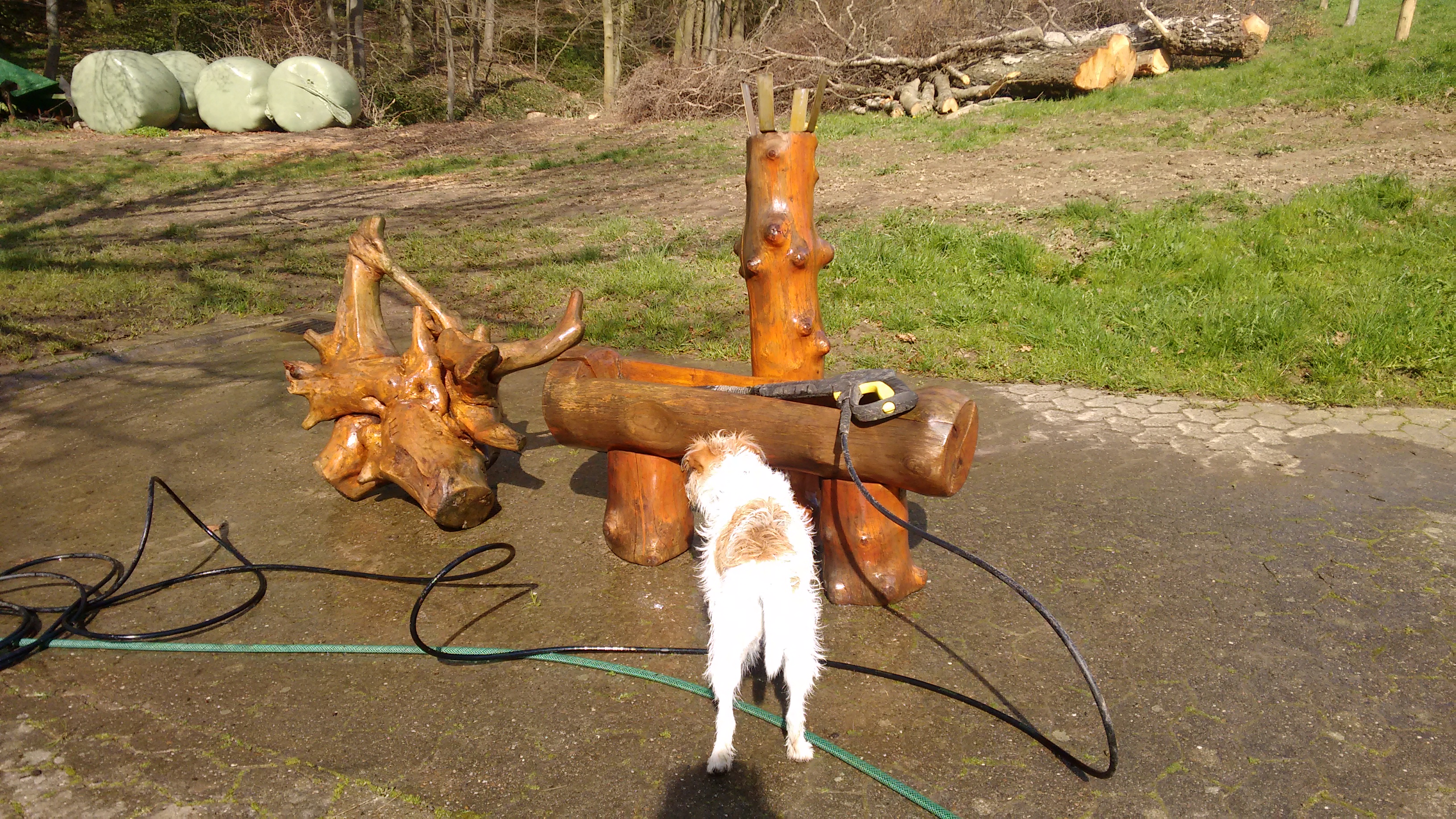 Für meine Mutter habe ich dann noch ihre Baumwurzel und den Baum“Blumenkasten“ abgespritzt. Dexter lief immer um mich herum und war natürlich auch entsprechend nass. 🙂 Er war ziemlich enttäuscht, dass ich danach den Kärcher weg brachte.