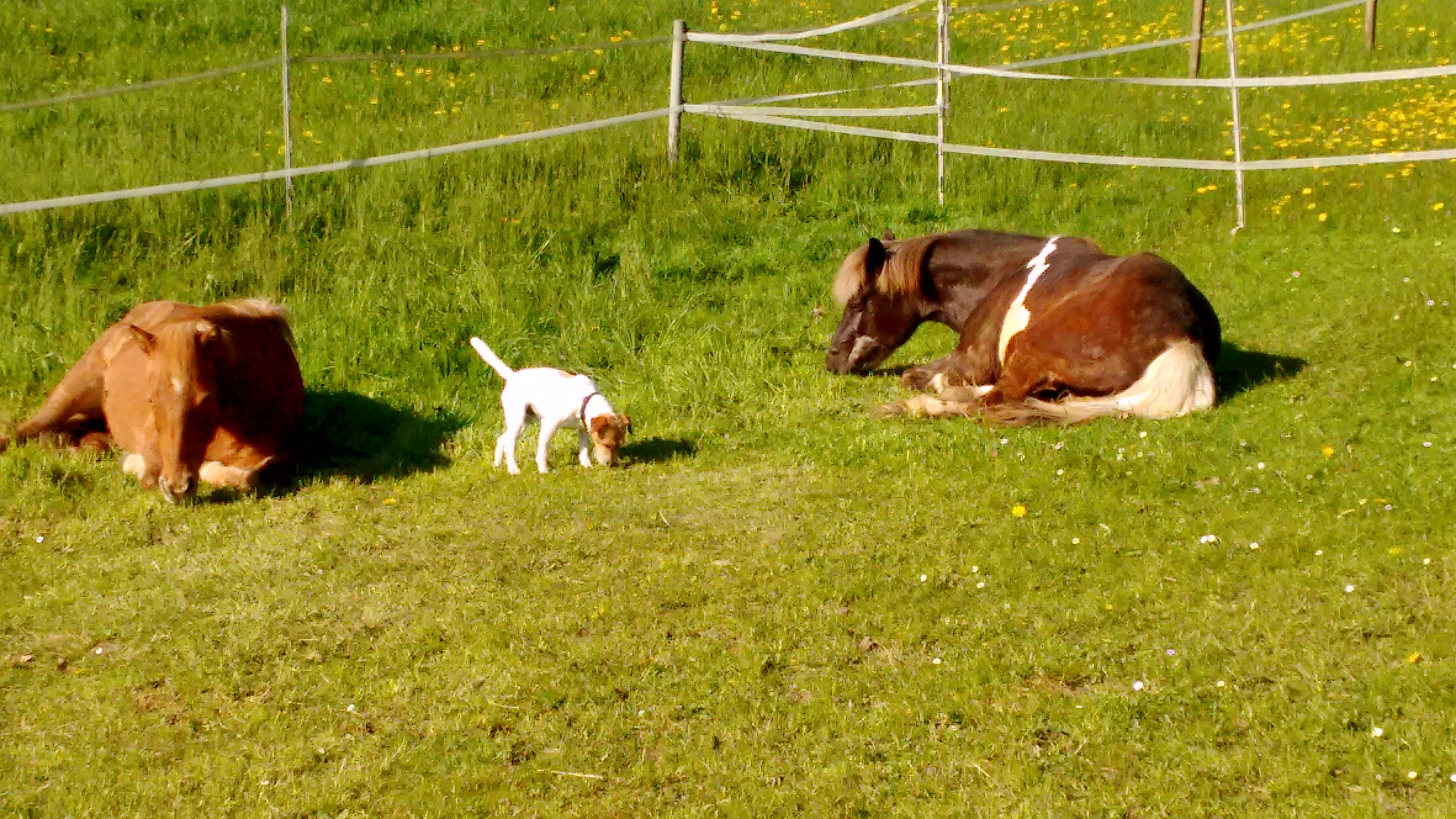 Die Pferde genießen es, dass sie nun jeden Tag ein wenig auf die Wiese dürfen. Erst wird eine halbe Stunde gefressen, dann entspannt und ausgeruht. Dexter bewacht seine Damen sehr. So wie er sie auf die Weide bringt und auch wieder mit reinholt, ist an ihm ein kleiner Hütehund verloren gegangen. 🙂