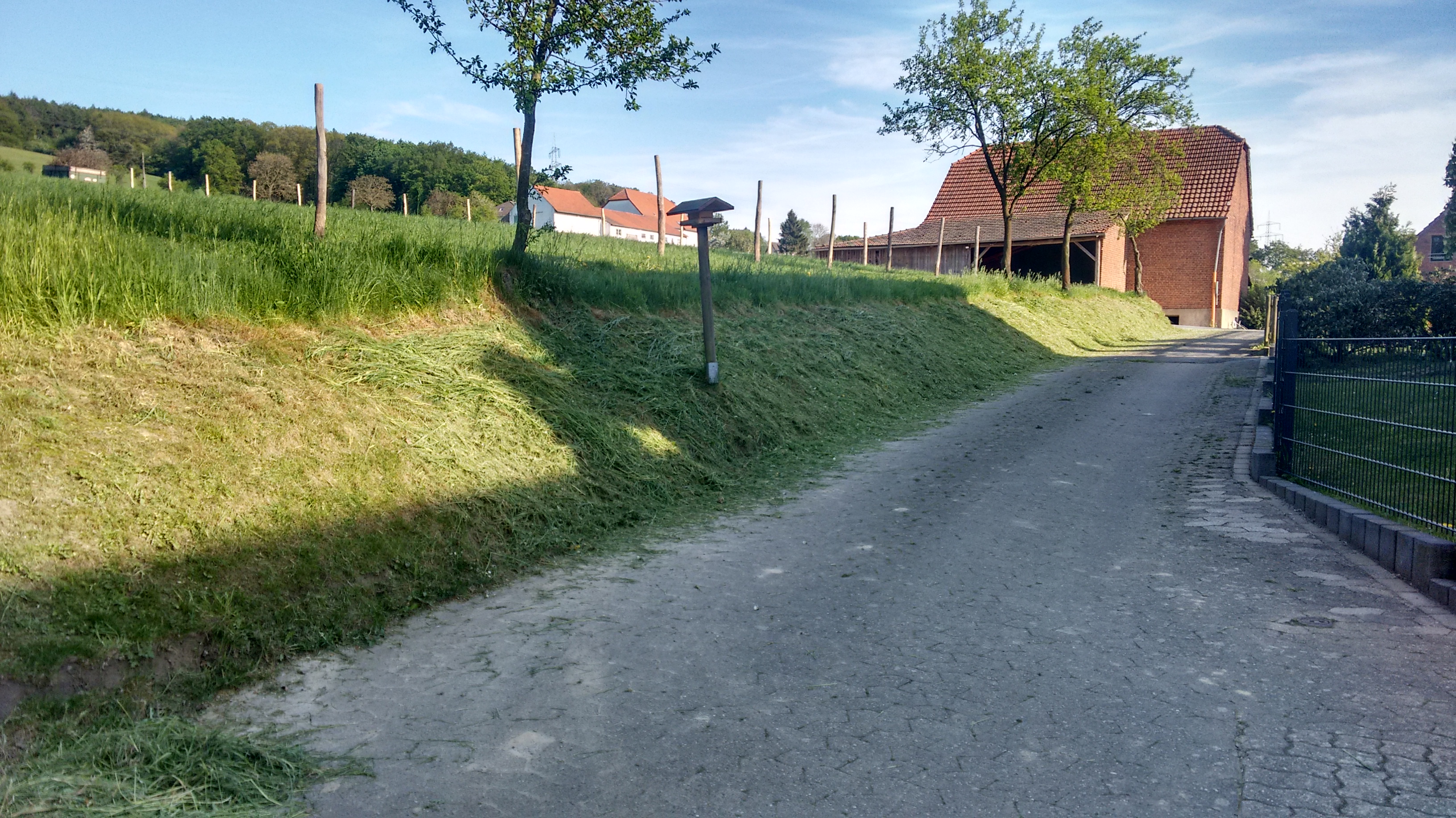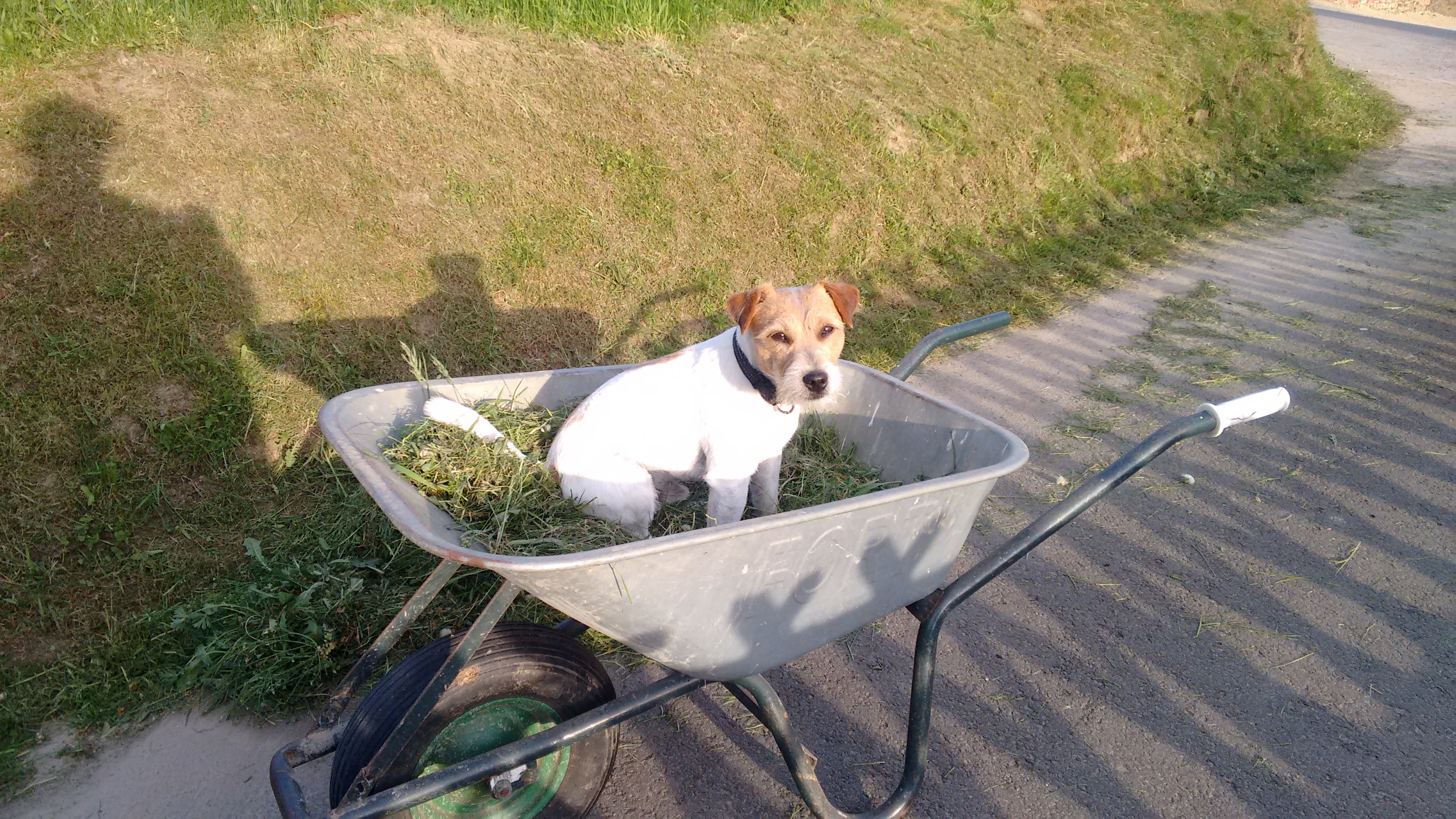 Dexter lief immer umher. Sah bei den Pferden nach dem Rechten, guckte kurz bei unseren Nachbarn, war dann aber schnell wieder bei mir. Nach 2 Stunden Motorbrummen, war das Gras an der Böschung ab und meine Mutter und ich beganngen mit dem zusammenharken.