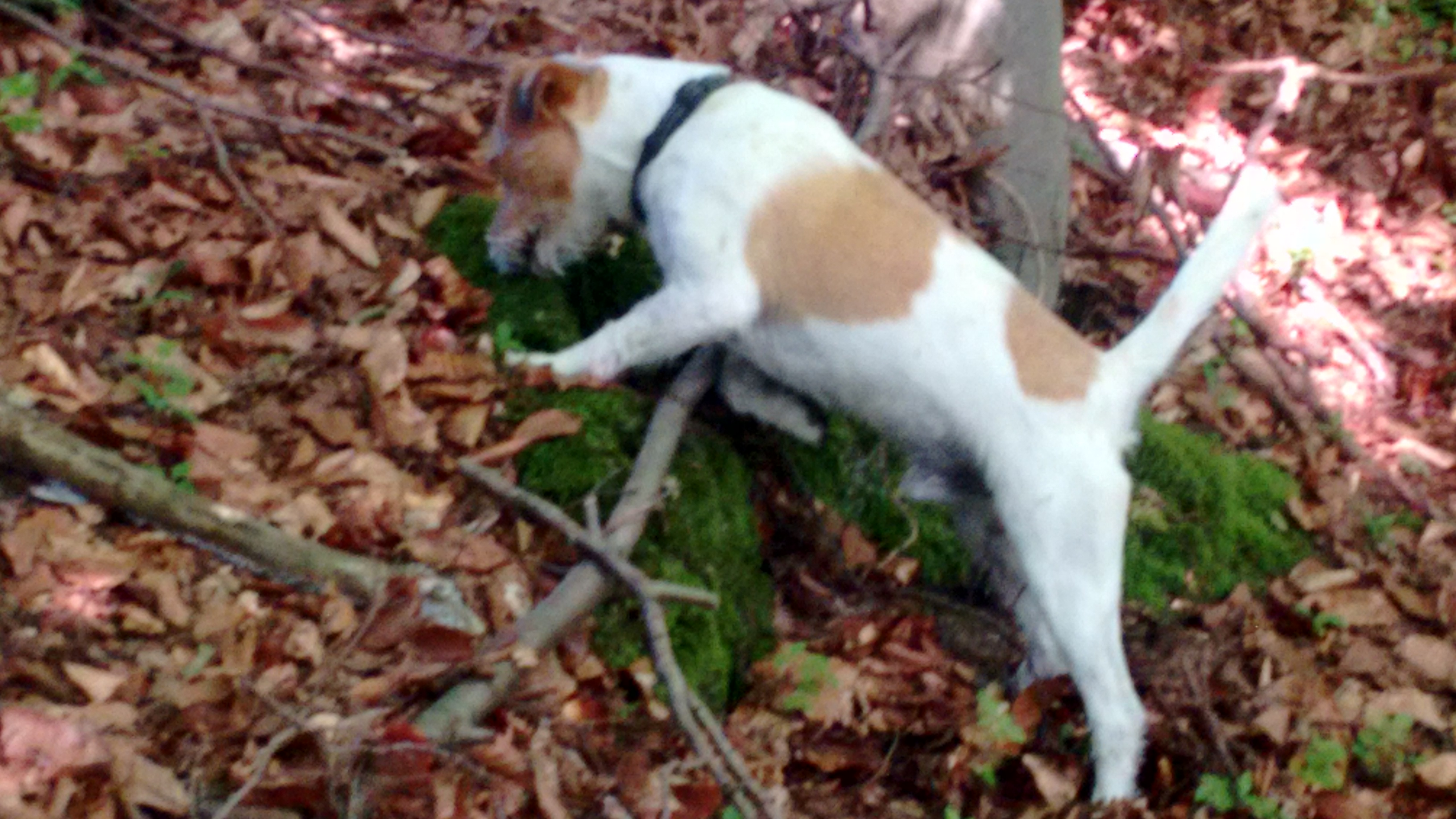 Der Hund fand es total toll, und hüpfte auch einmal in den Bach, aber schnuppern auf dem Waldboden fand er doch interessanter