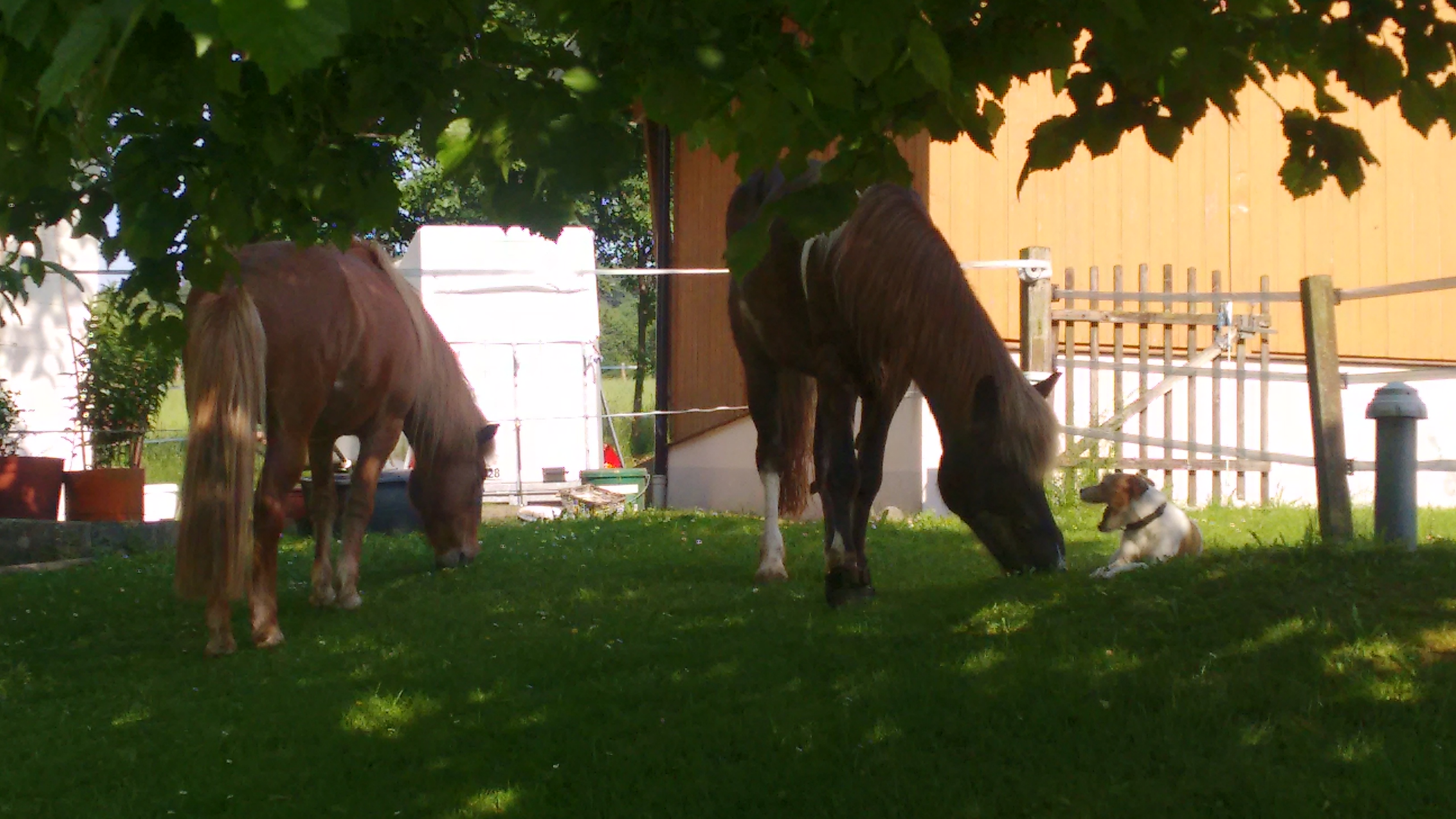 Während ich den Pferdestall wieder sauber gemacht und gemistet habe, kamen die Pferde von der Teichwiese an. Dort ist kein Schatten und die Damen hatten gesehen, das ich das Stalltor nicht zugemacht habe. So nutzten sie die Gunst der Stunde und machten einen Durchmarsch auf die schattige kleine Rasenfläche zwischen Haus und Offenstall. Ok – nicht schlimm – die Litze ist schnell gezogen, dann gehen sie wenigstens nicht weiter auf den Hof.