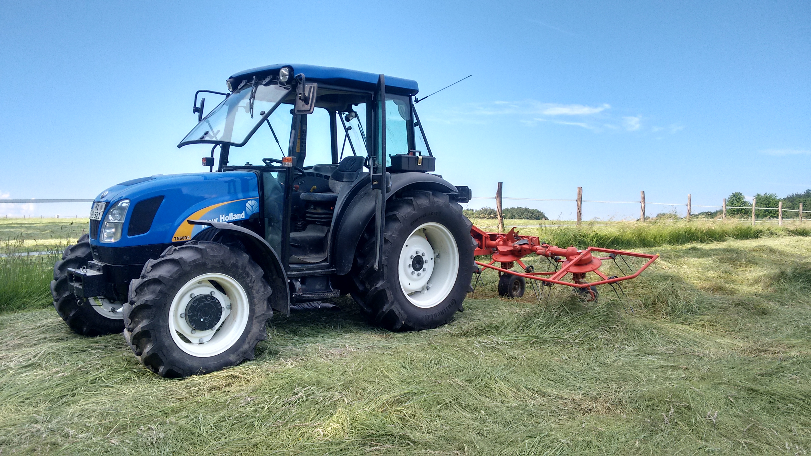 Die Sonne bruzzelte den Nachmittag über schön auf das gemähte Gras. Diesmal ist richtig ordentlich was drauf auf der Wiese. Scheint so, das ich wohl keinen zweiten Schnitt planen muss. Aber abwarten, wie das Heu so wird. Gegen 17 Uhr habe ich den Heuwender an den New Holland gemacht und das Gras das erste Mal gewendet.
