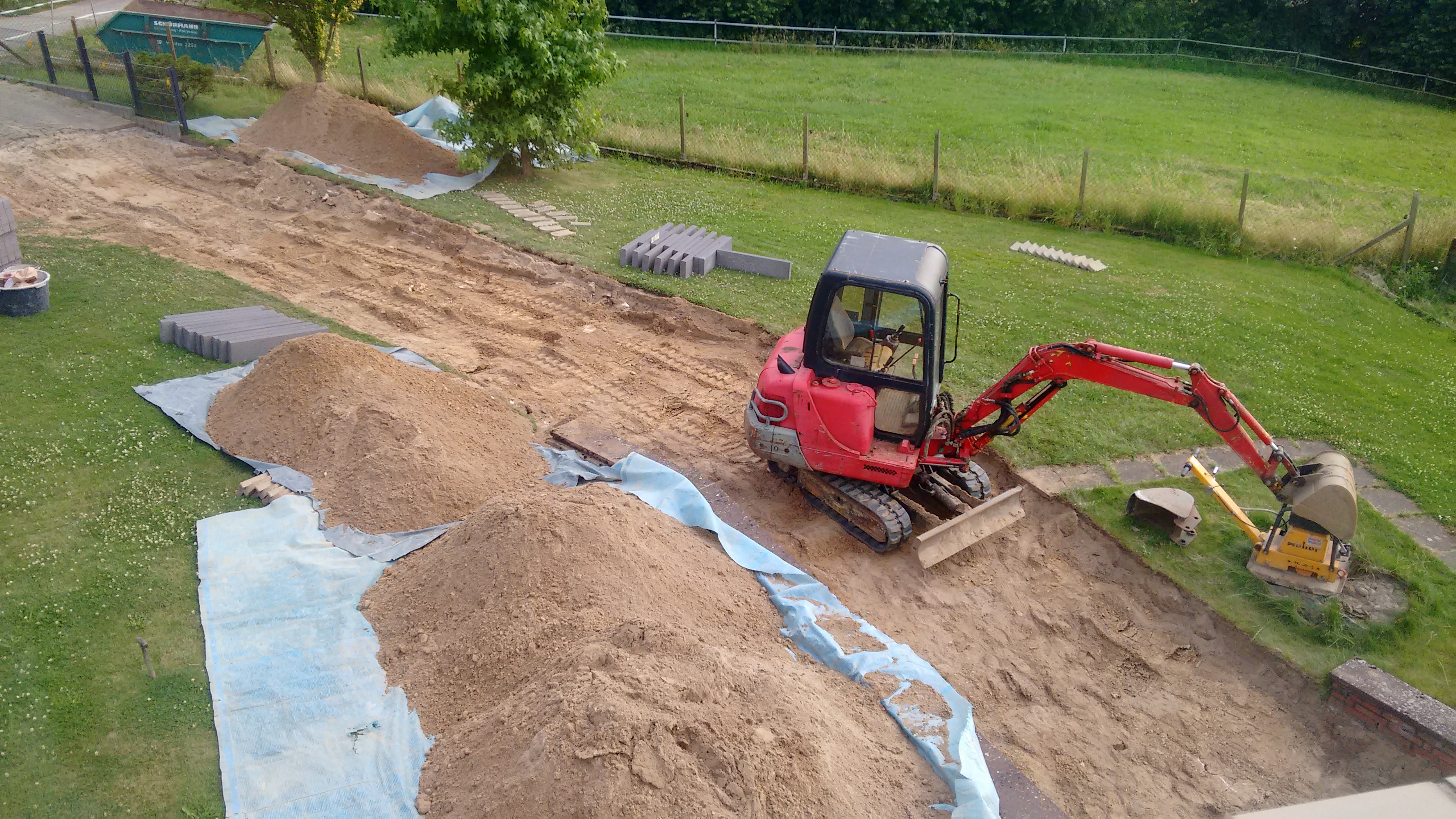 Nachdem ich den Zaun entfernt hatte, weil es ja „losgehen“ sollte, mussten wir doch erst noch warten. Die Firma fing doch eine Woche später als geplant an zu buddeln. Dann aber gleich richtig mit Vollgas.