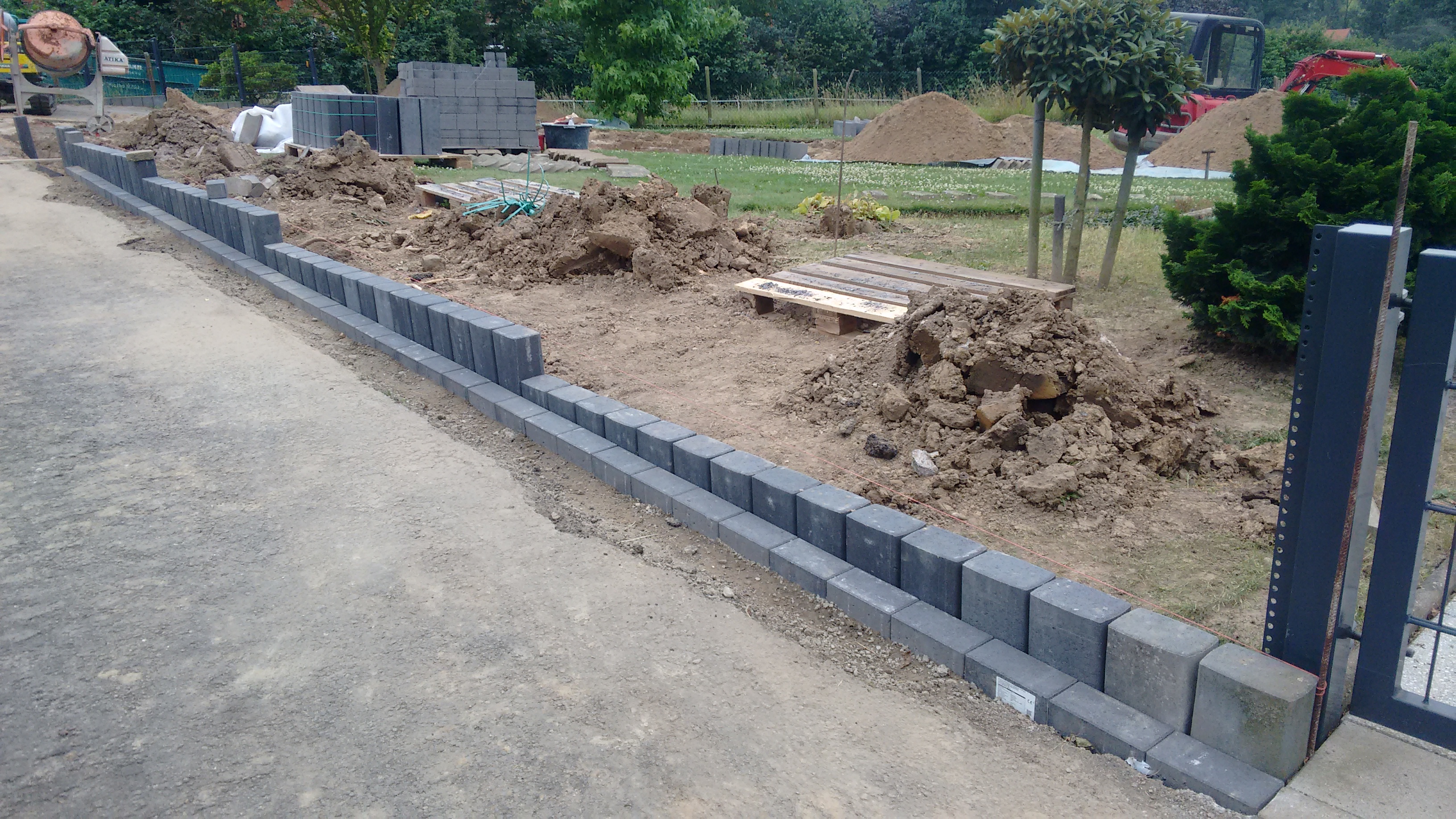 An Tag zwei war die kleine Begrenzungsmauer zum Weg schon wieder fast fertig gesetzt, als ich aus dem Büro nach Hause kam. Die Woche kamen die Männer gut voran. Leider waren die Spurrillen in der Garageneinfahrt sehr tief eingefahren und „damals“ hatte mein Vater auch nur den Lehmboden gradegezogen und mit Splitt und Sand aufgefüllt. Das musste nun dann doch korrigiert werden. Also alles auskoffern und mit richtig Unterbau versehen. Was sein muss, muss sein.