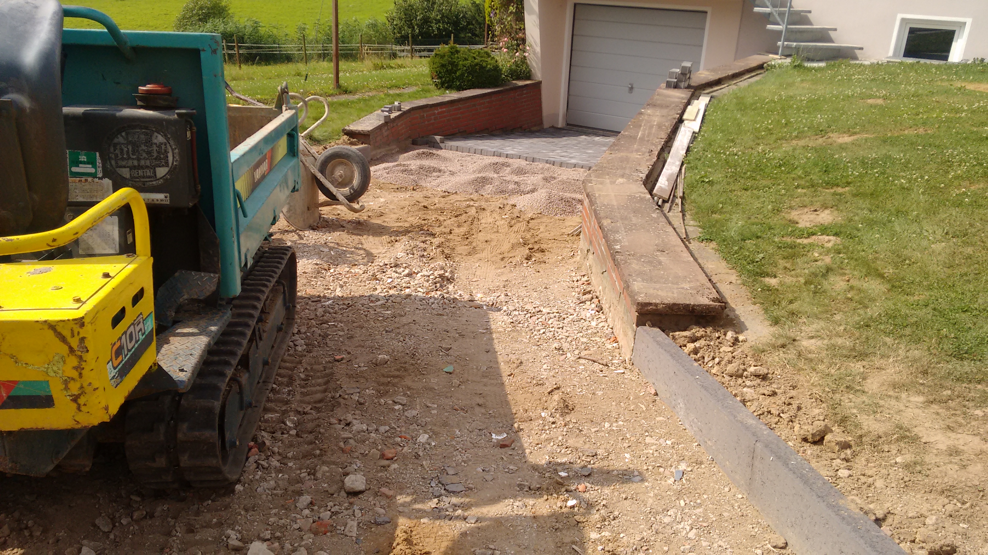 Am ersten Tag wurde das alte Pflaster der Garageneinfahrt entfernt und auch die Betonkante zum Weg kam weg.