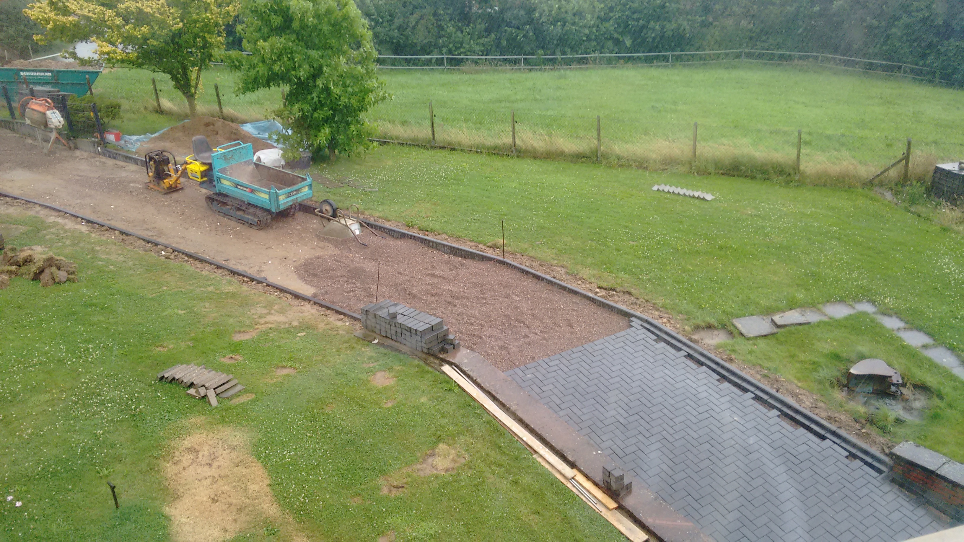 und dann wurde es nach und nach immer ein bißchen fertiger in unserer Garageneinfahrt. In der zweiten Woche war es leider ziemlich regnerisch, so dass die Baustelle an 2 Tagen komplett ruhte – aber naja, wenn es nicht geht…