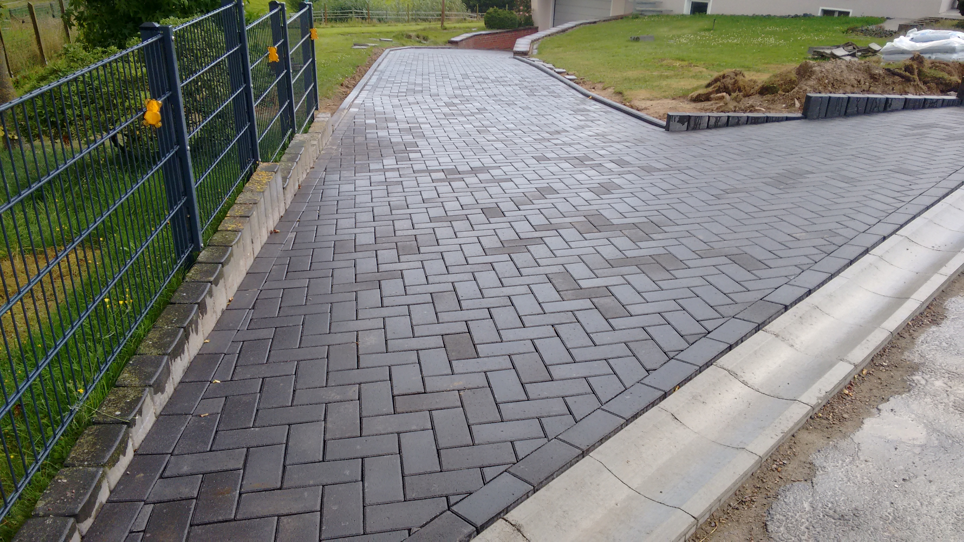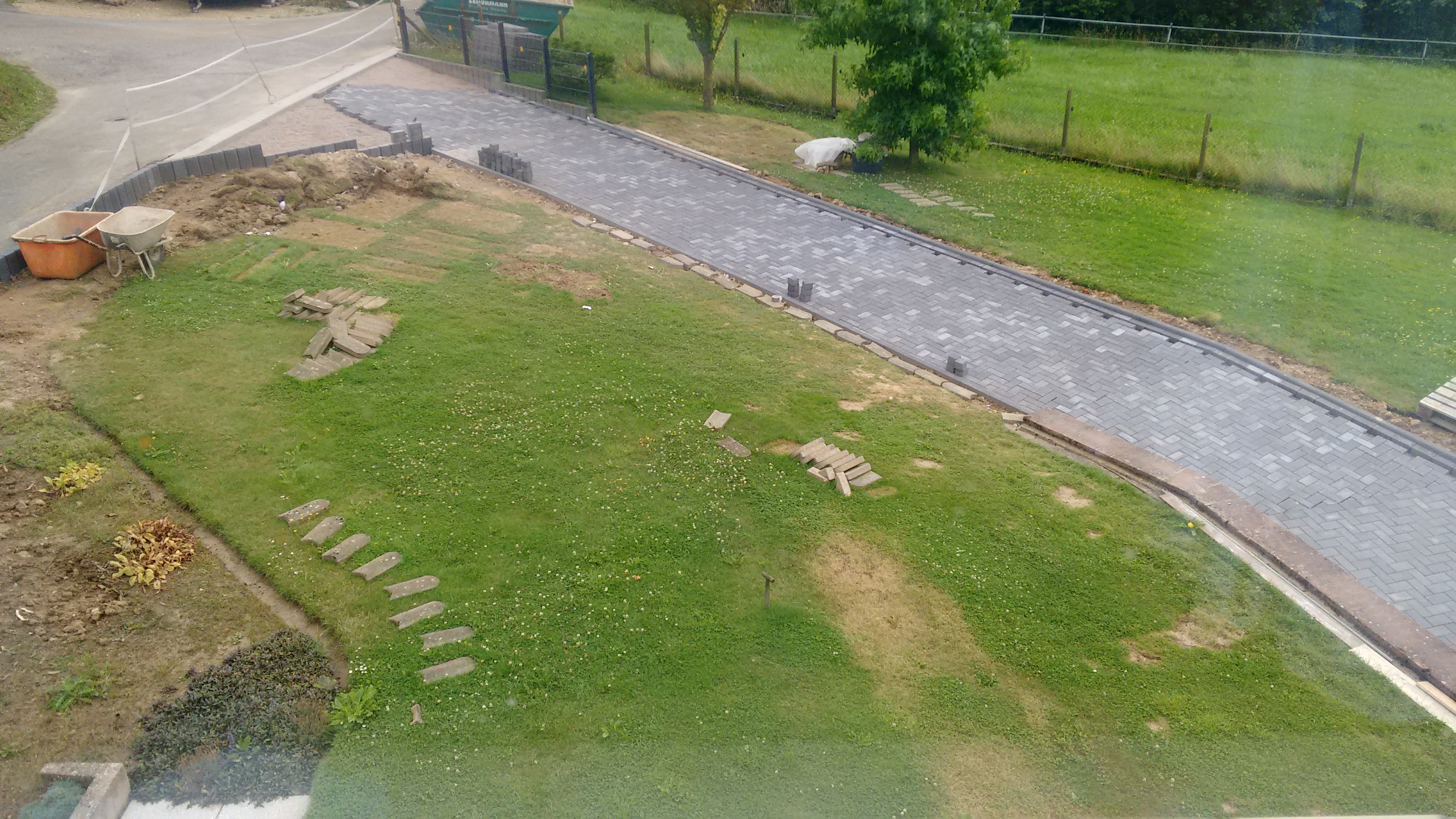 Dafür ist es nun auch komplett fertig gepflastert und der erste Füllsand/Splitt wurde auch eingefegt. Wir haben aber noch ein paar Eimer und Säcke mit Füllmaterial, dass werde ich nach und nach noch selbst einfegen. Benutzen könnten wir den Weg aber schon. Doch der sieht so schön aus – den schonen wir noch ein wenig. Naja, nur so lange, bis alle Rillen augefüllt sind und sich das ganze etwas gesetzt hat. Die Löcher in der Teerdecke vor dem Garten lang und an der Regenrille, werden wohl bei besserem Wetter in der kommenden Woche wieder gefüllt hat uns der Chef versprochen.