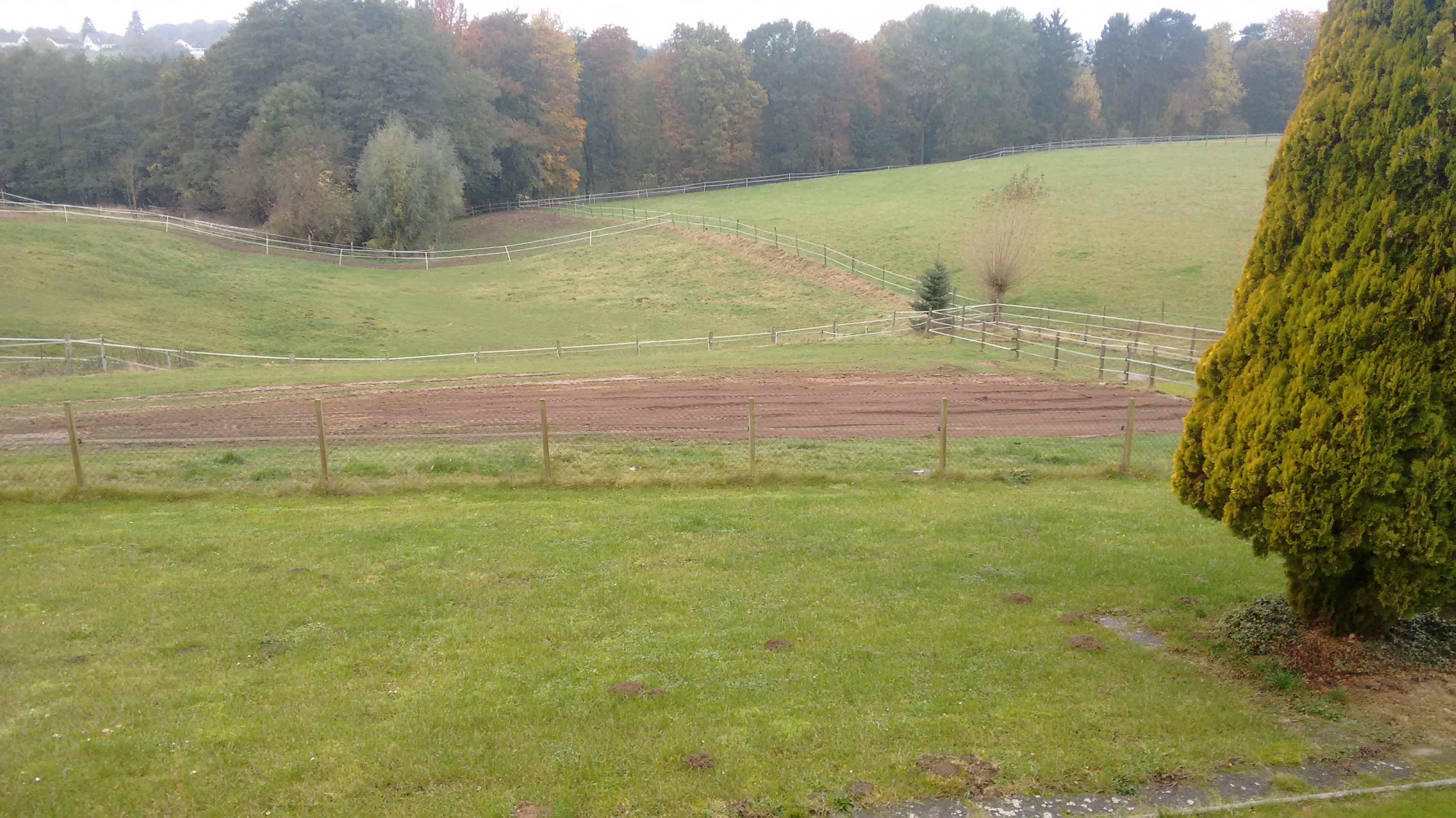 Den Hof haben wir nochmal gefegt, bzw. mein Bruder pustete mit dem Laubbläser umher, ich habe etwas Laub am Offenstall weggefegt, der Stal musste gemistet, die Pferde mal geputzt werden. Ein paar Einschlaghülsen, die für den Zaun um den Schilfteich in die Erde gerammt waren, haben die Bauarbeiter heile heraus bekommen und mir an die Seite gelegt. Habe ich also von der Wiese geholt. Dann musste ich den Zaun zum Weg und den Zaun zwischen den Weiden wieder ziehen. Eine der Einschlaghülsen vom Zwischenzaun ist durch die Bagger/Baumaschinen leider zerfahren worden. Die anderen Hülsen waren nur etwas voll Erde. Habe ich frei gekratzt und konnte die Zaunpfähle wieder einstecken. Den einen Pfahl habe ich zunächst mit einem Steckpfahl ersetzt. Habe nun ja genug Hülsen, da bekommme ich auch wieder einen festen Pfahl hin.