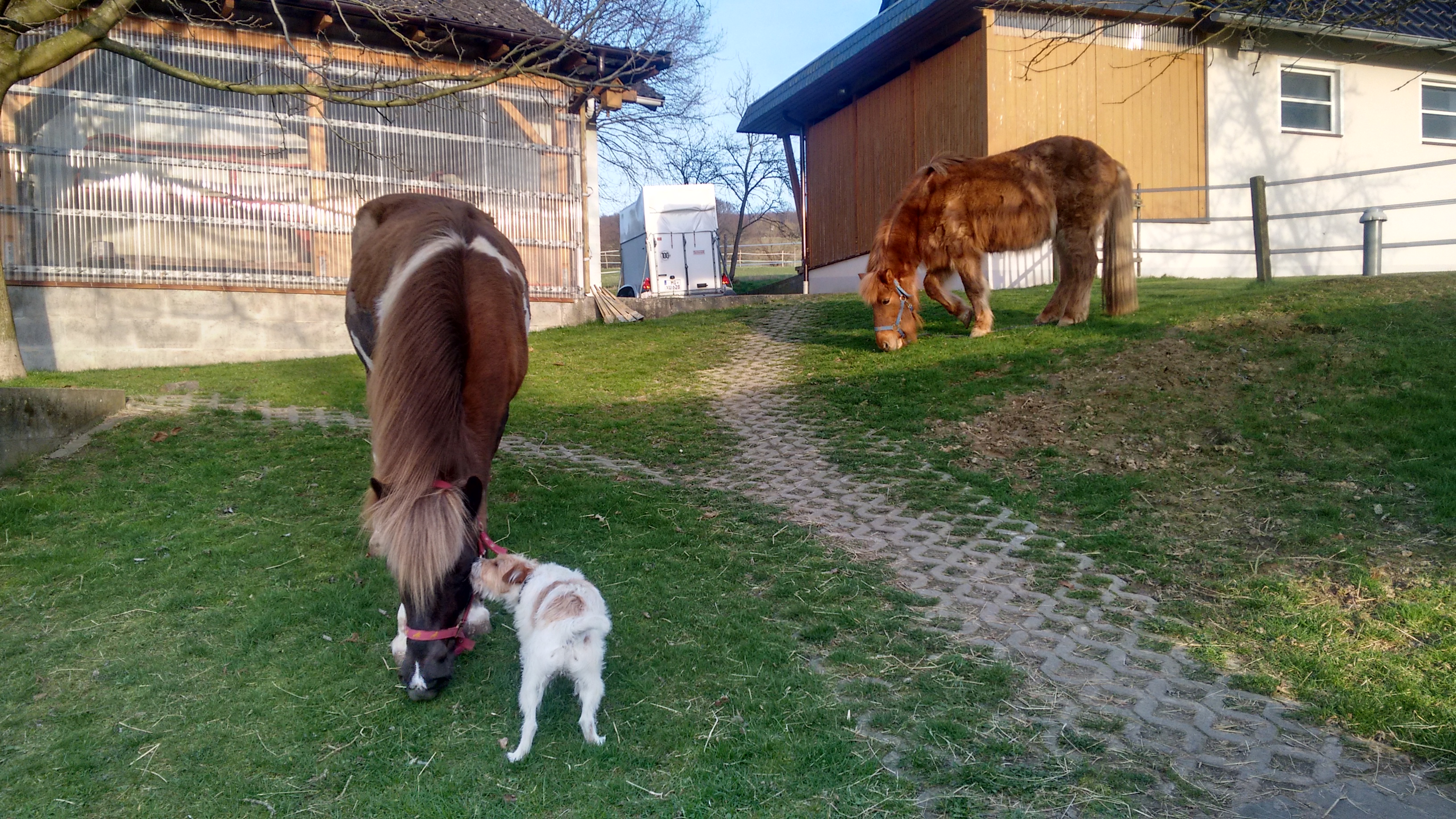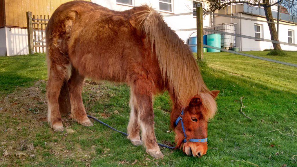 Ja, auch bei den Pferden bemerkt man, dass es Frühling wird. Svandis wirft ordentlich Winterpelz ab und schwitzt schon vom rumstehen. Auch Björt ist oft feucht im Fell, weil es ihr so warm ist. Das alte Mädchen hält aber noch an ihrem Winterfell fest. Da Svandis schon immer ein nicht gerade „feines Mädchen“ war, schläft sie auch gern mal da wo es warm und feucht ist – sprich im Stall in der Einstreu. Im langen Winterfell klebt das dann ganz toll zusammen. Die letzten Jahre habe ich sie im Frühjahr immer gewaschen und geschrubbt bis die Mistflecken weg waren. Das ziept dem Tier, ist nicht nett und ich sehe danach auch nicht gerade sauber aus. Daher habe ich mir 2016 ja eine Schermaschine zugelegt. Super Erfindung so ein Teil. Sonntag habe ich daher am Nachmittag zunächst die Pferde grob über geputzt, das war schon mal ein großer Eimer voll Haare, die ich aus den beiden herausgebürstet habe. Dann aber doch die Schermaschine hervorgeholt und Svandis geschoren. Hals und Rücken habe ich ihr noch das Fell gelassen.