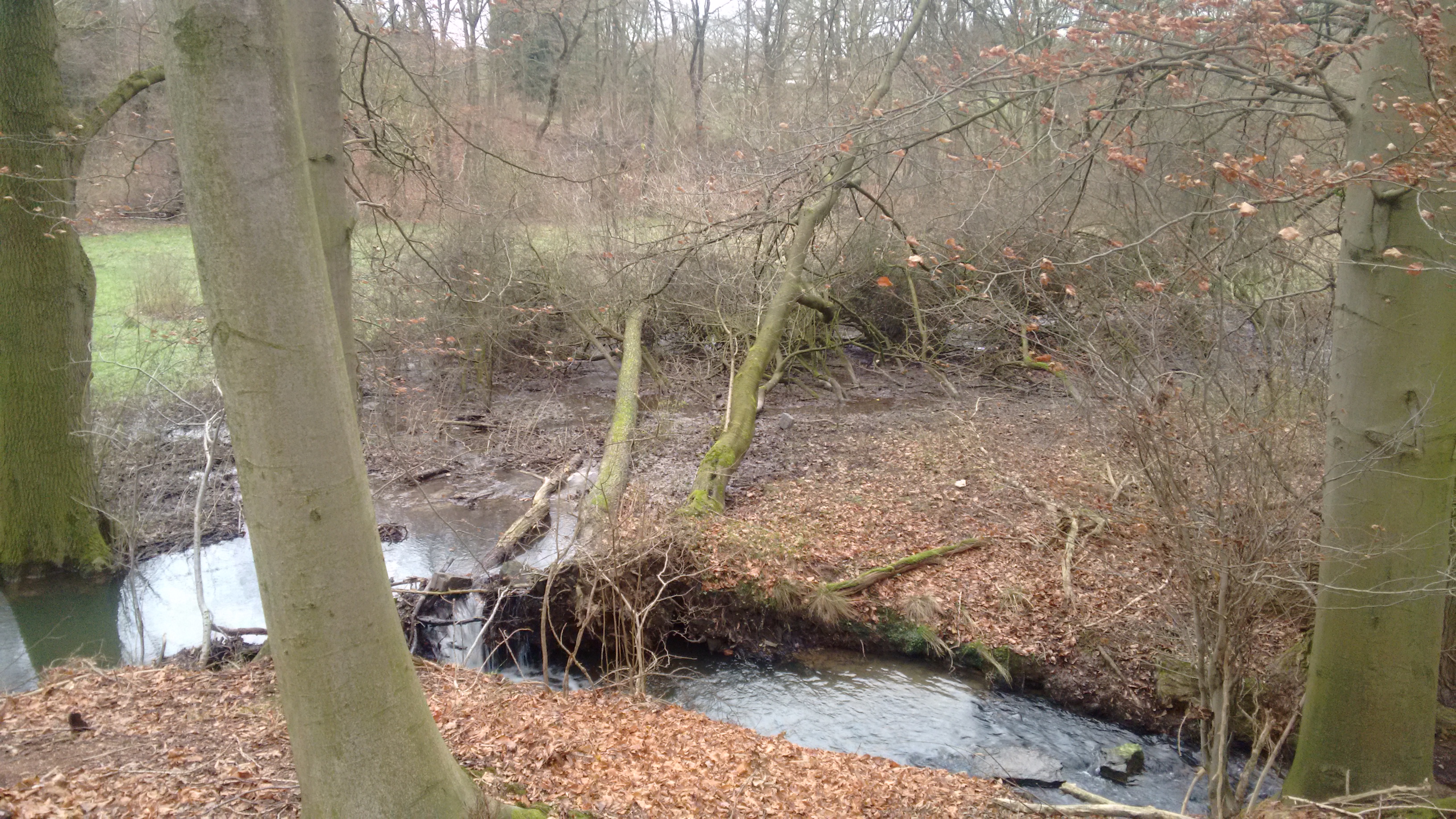 Im Wald war auch alles feucht. Auf unserer Waldseite sind am Boden oder den Bäumen keine Wildschäden zu sehen. Der Blick über den Borstenbach zeigte, wie schon die letzten Winter, die große Schweinesuhle und ebenso viele tiefe Löcher wie auf meiner Wiese. Der Borstenbach führt unheimlich viel Wasser.