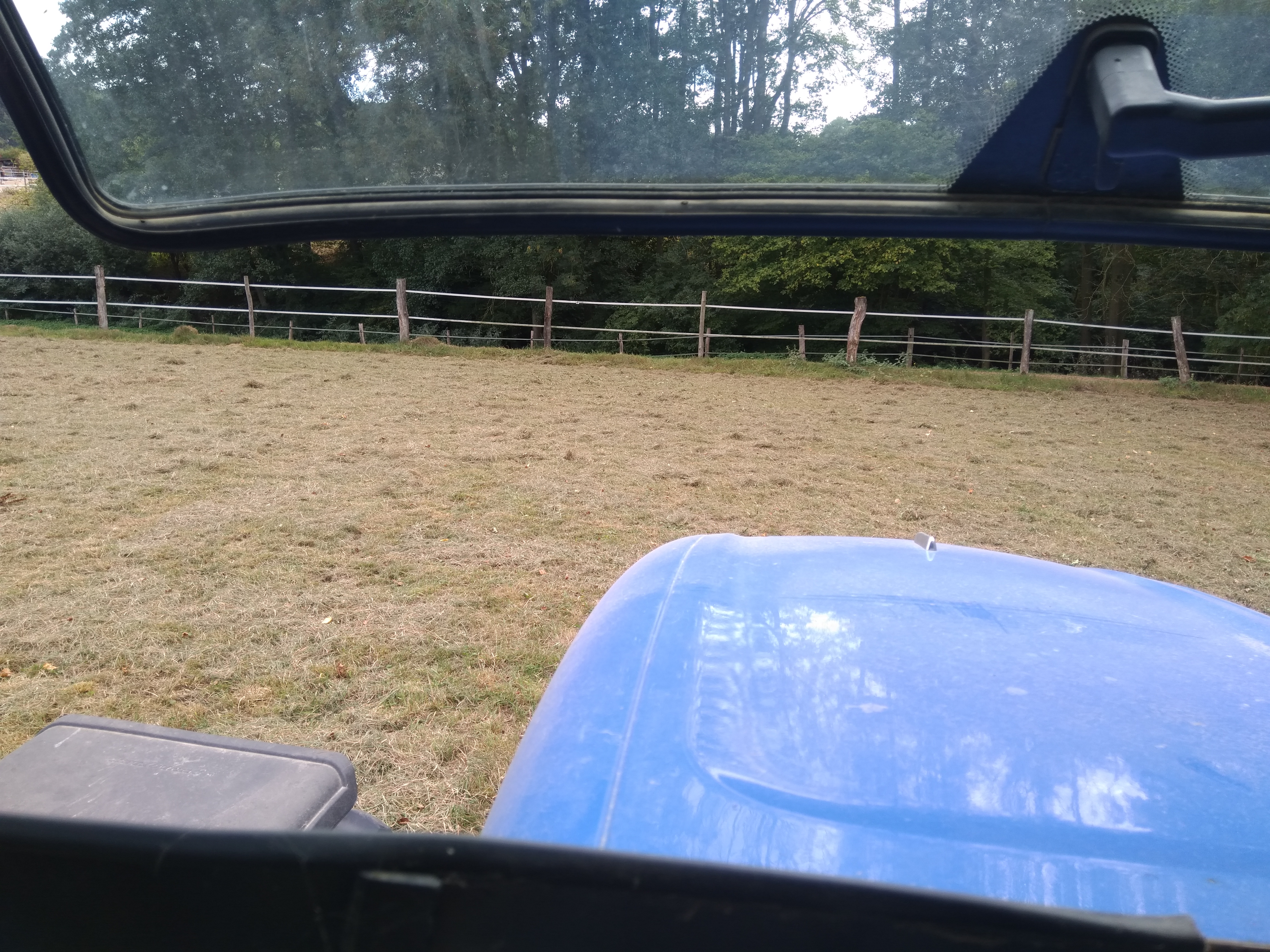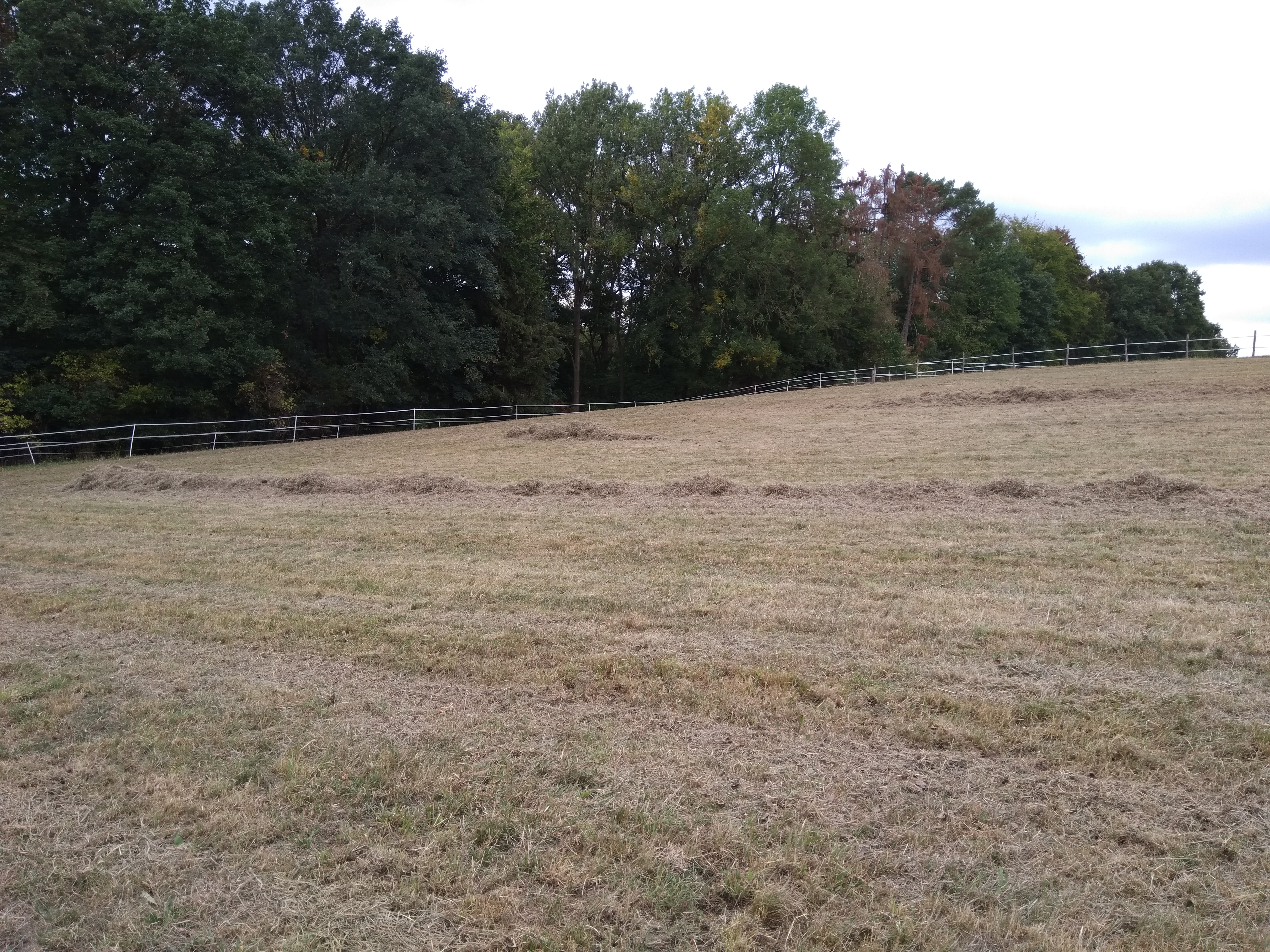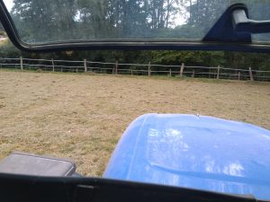 Montagnachmittag habe ich das bißchen Gras bereits in Reihe gezogen. Auch am Wald im Halbschatten war das Gras schon super durchgetrocknet. Das in Schwaden legen war gruselig, denn teilweise habe ich wegen dem ganzen Staub wirklich nichts mehr gesehen. Dann musste ich warten, bis der Staub sich verzogen hatte, um zu sehen wo ich lang fahren musste. In der Mitte der Wiese hatte ich eine lange Reihe zusammengezogen und am Wald, wo etwas mehr Gras war, lagen 2 halbe Reihen. Nachdem das bißchen Gras zusammengezogen war, habe ich Wender und Schwader auch wieder sauber gemacht und in den Schuppen gestellt. Auch der Trecker brauchte eine Dusche, denn durch die Fenster konnte man die Umgebung nur noch Schemenhaft sehen. Da es nur so sehr wenig Heu und so fusseliges Zeug war, habe ich es nicht pressen lassen. Meine Mutter und ich wollten das ganze lose einfahren.