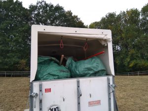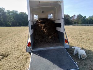So sind wir Dienstagnachmittag mit dem Yeti und dem Pferdehänger auf die Wiese gefahren und haben das Heu in den Hänger gepackt. Mit einer Forke kam man nicht weit. So haben wir mit Laubrechen und Laubsack das Heu zusammengeharkt und in den Hänger gepackt. Dienstag haben wir nur einen Hänger voll gepackt und auch wieder abgeladen. Beim Heu in den Hänger wuppen, hat es in meinem Rücken „Knack“ gemacht und zwar so laut, das es meine Mutter ein paar Meter weiter gehört hat. Danach tat fast jede Bewegung arg weh, daher auch nach dem Abladen nicht wieder auf die Wiese. Mittwoch Mittag ging es aber weiter.
