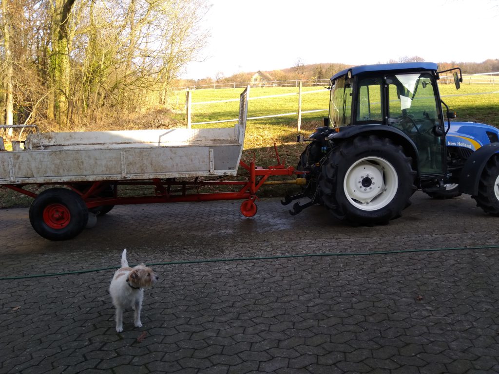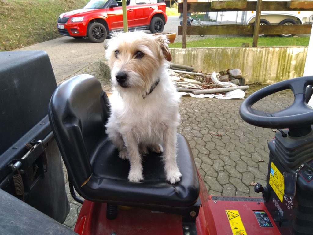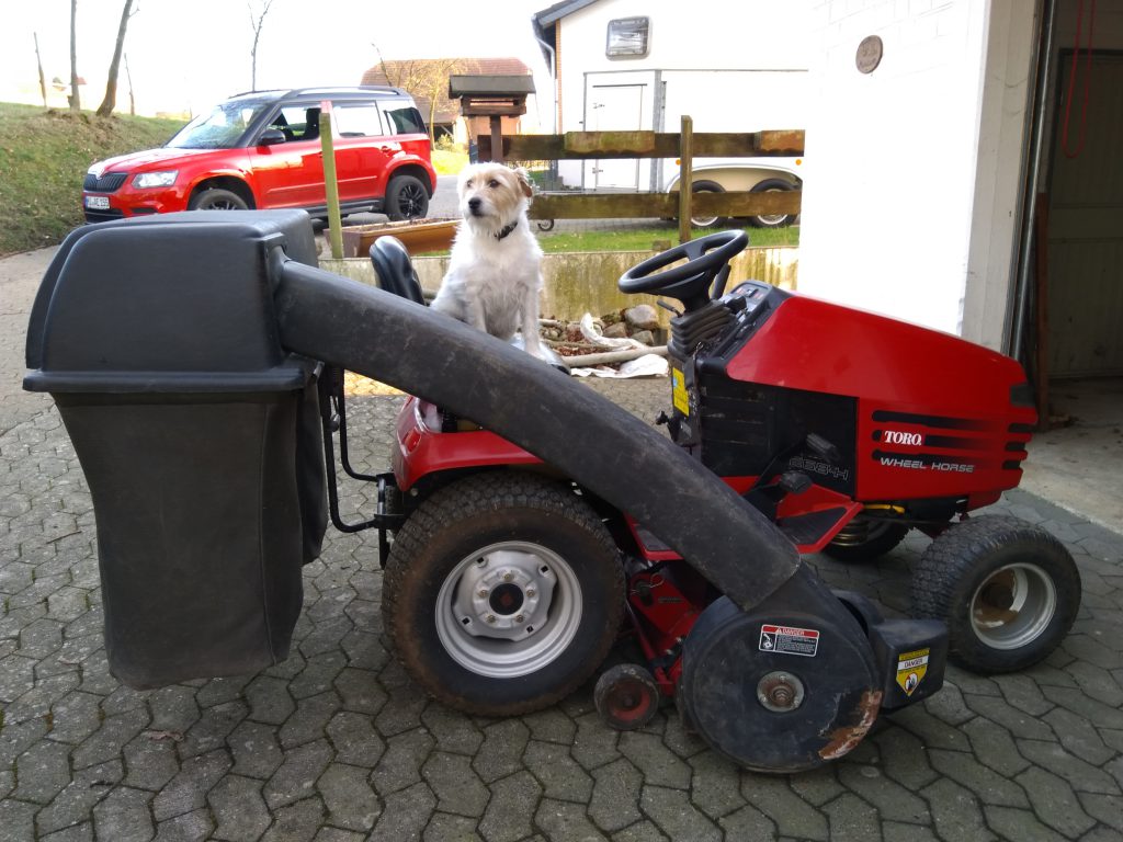 Samstag nach dem üblichen vormittäglichem Wocheneinkauf, habe ich am Nachmittag den Trecker angeworfen und den Dungstreuer aus dem Carport geholt. Hochdruckreiniger angeschlossen und Hänger und Trecker von den Resten des Mistfahrens im Januar befreit. Dexter fand Treckerfahren und mit Wasser spielen total toll und war immer mit dabei. Nachdem der Trecker und der Hänger wieder sauber waren, habe ich den Dungstreuer wieder ordentlich in den Carport geschoben. Da ich früher oder später auch wieder Rasen mähen muss, habe ich dann auch noch den Toro heraus gefahren und Dexter saß natürlich wieder mit auf dem Gerät.