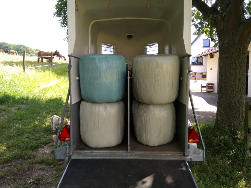 Nachdem ich Donnerstag die Geräte und den Trecker wieder sauer gemacht hatte und alles wieder im Schuppen sicher verstaut steht, konnte es am Freitag weiter gehen. Die Heulageballen mussten ja noch von der Heuwiese herunter. Freitag früh musste ich aber erstmal einkaufen fahren. Am Nachmittag habe ich dann den Pferdehänger an den Yeti gemacht und die ersten 12 Ballen in den Wagen gestapelt und abgeladen. Ab dem 2ten Hänger voll hat meine Mutter mitgeholfen. 6 mal mussten wir hin und her fahren – da wir uns nicht zu sehr beeilt haben, benötigten wir etwas über 2 Stunden. Danach war die Heuwiese dann auch endgültig leer.