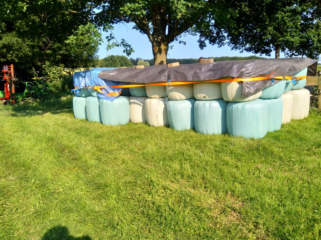 Wir haben über die Ballen noch Plane gezogen und die obere Schicht mit Spanngurten fixiert. Denn so ganz eben ist der Untergrund unter den Ballen nicht, umkippen sollen die uns auch nicht, und die Vögel oder sonstiges Getier soll nicht die Folie durchstechen. Ich denke, so kann das ganz gut dort liegen.