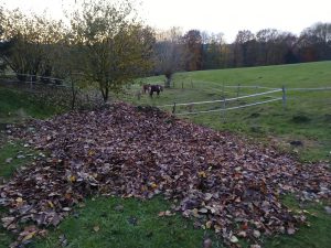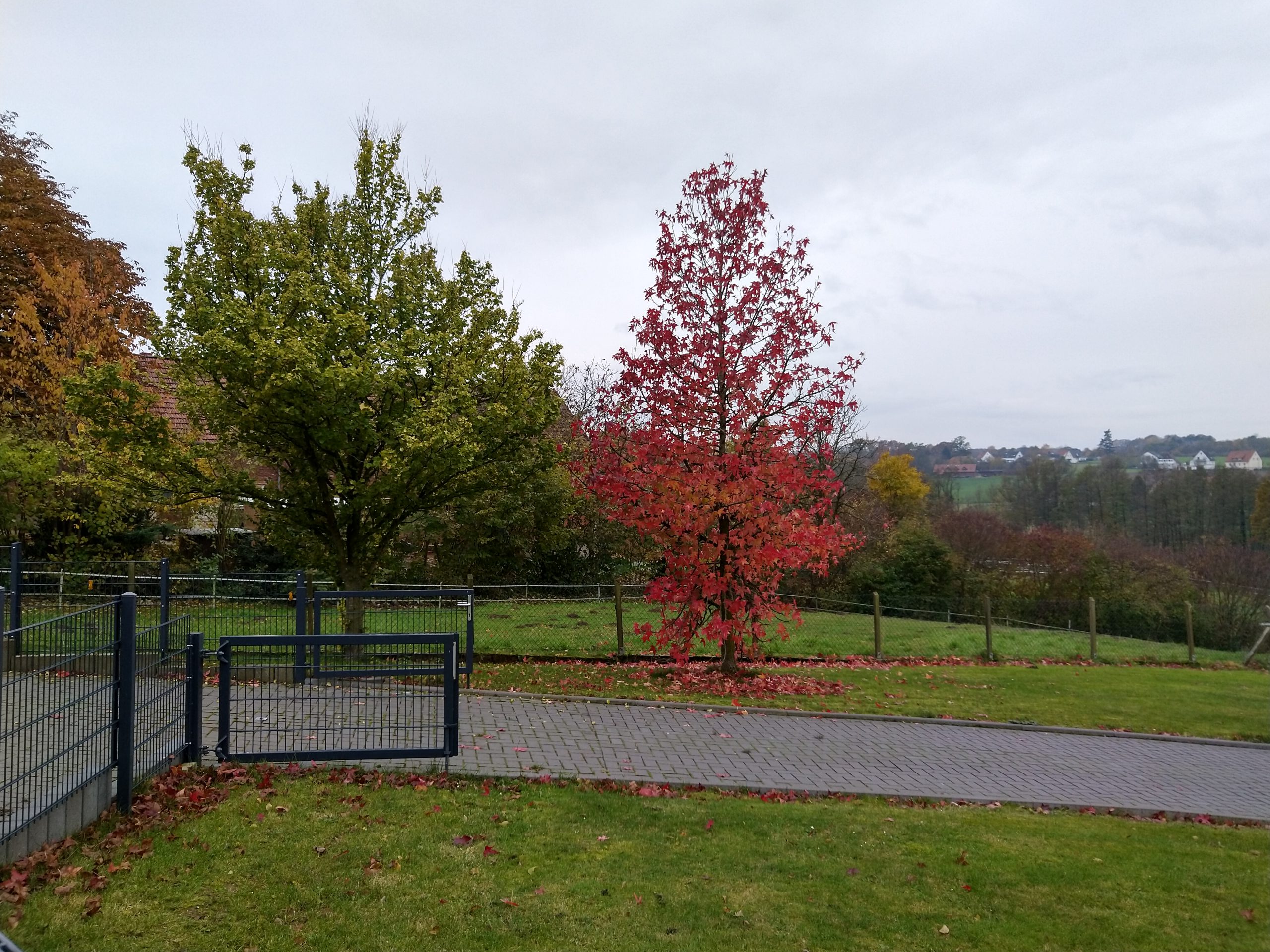 Die letzten Wochenenden habe ich dann noch ein bißchen für Hof und Garten genutzt. Eigentlich wollte ich vor 2 Wochen das doch noch recht lang gewachsene Gras an der Böschung abmähen, doch meine Motorsense war abgesoffen und ich bekam sie nicht an. Und als ich sie dann doch zum Laufen brachte, fing es an zu regnen. 🙁 Dumm gelaufen. Zum Mähen war es da jedenfalls zu nass. Doch da die 2 Eichen am Hof und der Walnussbaum ihre Blätter abwerfen, habe ich mit dem Laubpuster gespielt. Und die Sommerreifen von Yeti und Mutters Punto sauber gemacht und im Stall für Ordnung gesorgt. Eine kleine Minirunde mit Björt bin ich auch noch geritten. Und da war sie durchaus der Meinung, das 24 noch kein Alter für ein kleines Pferd ist. Letzten Samstag sprang meine Motorsense dann auch sofort an. Geht doch. Und ich konnte die Böschung abmähen, das Gras wegharken und auf den großen Komposthaufen bringen. Statt dann den ganzen Hof zu fegen, habe ich die Reste und das Laub dann wieder mit dem Laubpuster vom Hof gemacht und auch den Weg vom Hof zum Offenstall von Laub befreit – und auch etwas die Wiese hinter dem Schuppen. Doch die Eiche lässt noch nicht so viele Blätter fallen. Der Walnussbaum nun ziemlich blattlos. Die beiden Zierbäume vorn im Garten haben (außer an der Blätterfarbe) noch nicht mitbekommen, das Herbst ist. Wenn die Hecke unseres Nachbarn endlich das Laub abgeworfen hat, kann ich meine Weide an der Grenze dann auch vom Laub befreien. Da ist das Gras sowieso nicht gut, wenn dann noch das Laub dort verrottet, dann wächst da gar nichts mehr, was die Pferde fressen können.
