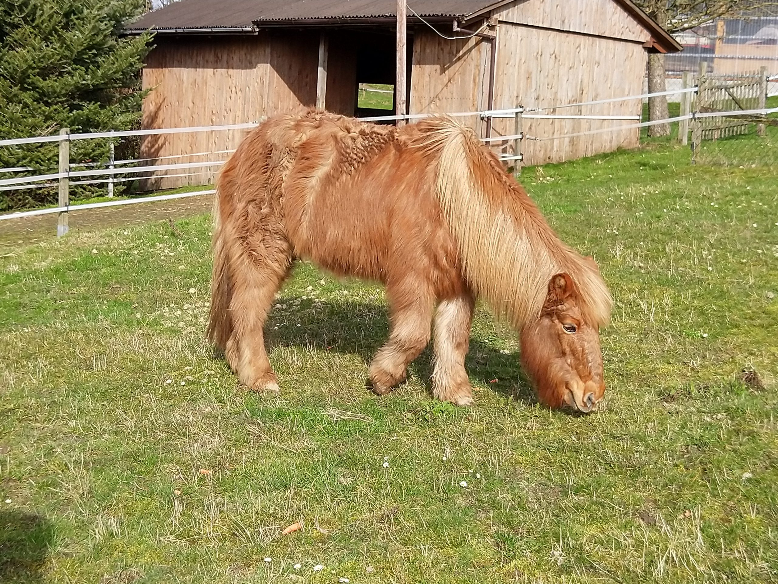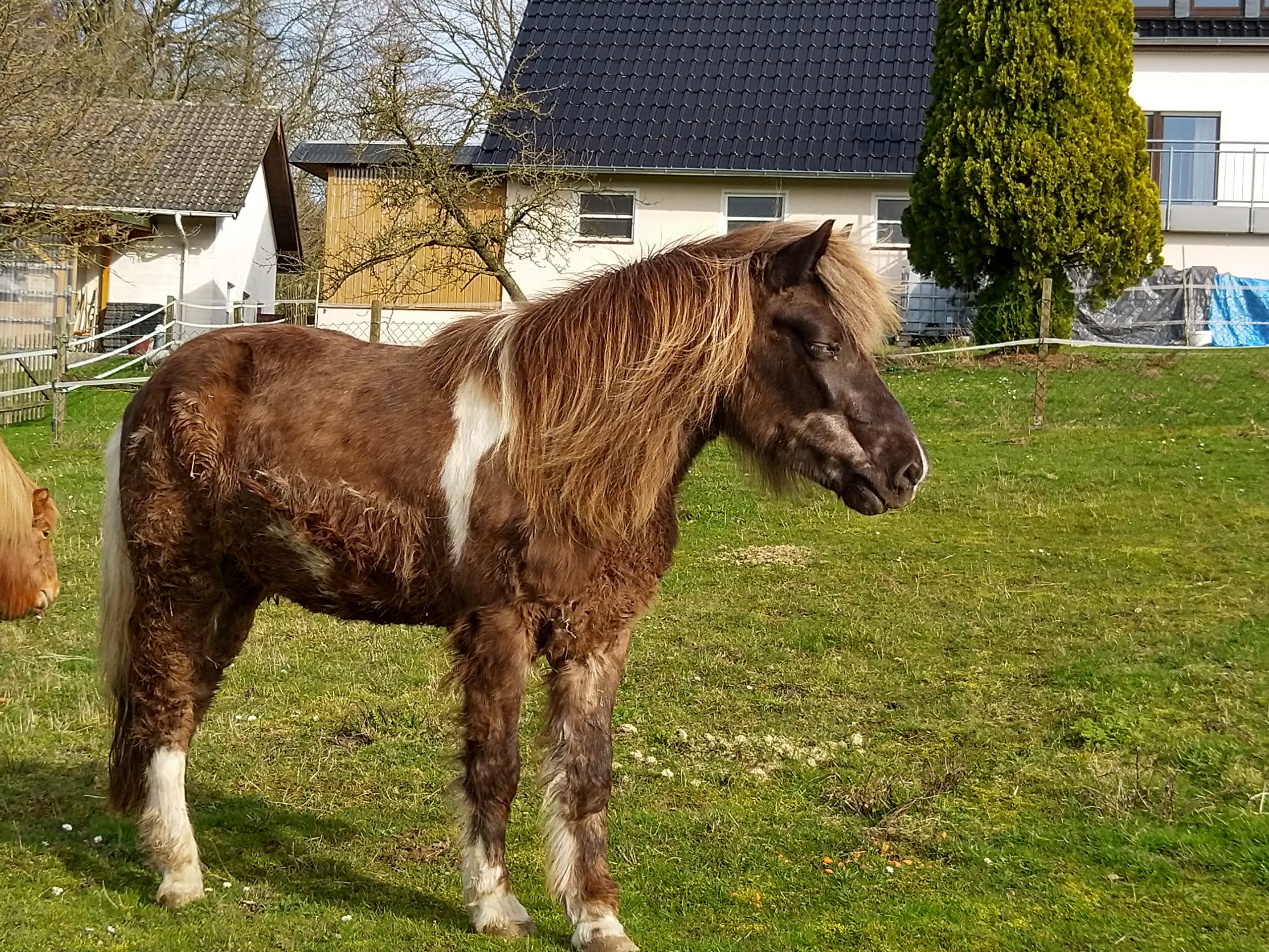 Svandis verliert schon Massen an Fell, Björt hält ihren Pelz noch sehr fest. Björt hat den „Winter“ futtermäßig gut überstanden und zum Glück sogar etwas zugenommen. Mein altes Mädchen ist schon sehr, sehr schlank unter ihrem Pelz, daher freut es mich, dass sie nicht weiter abgebaut hat. Als ich die Damen dann wieder in den reparierten Paddock bringen wollte, kam bei beiden der Ponydickkopf durch. Björt rannte umher wie ein kleiner Kugelblitz und bockte dabei herum. Auch Svandis zeigte, dass die durchaus Spaß an der Bewegung hat und ordentlich Gas geben kann. Habe dann eben ein Halfter geholt um das Toben zu beenden, und mit Halfter kam Svandis auch artig mit – und Björt wollte keinesfalls allein bleiben.