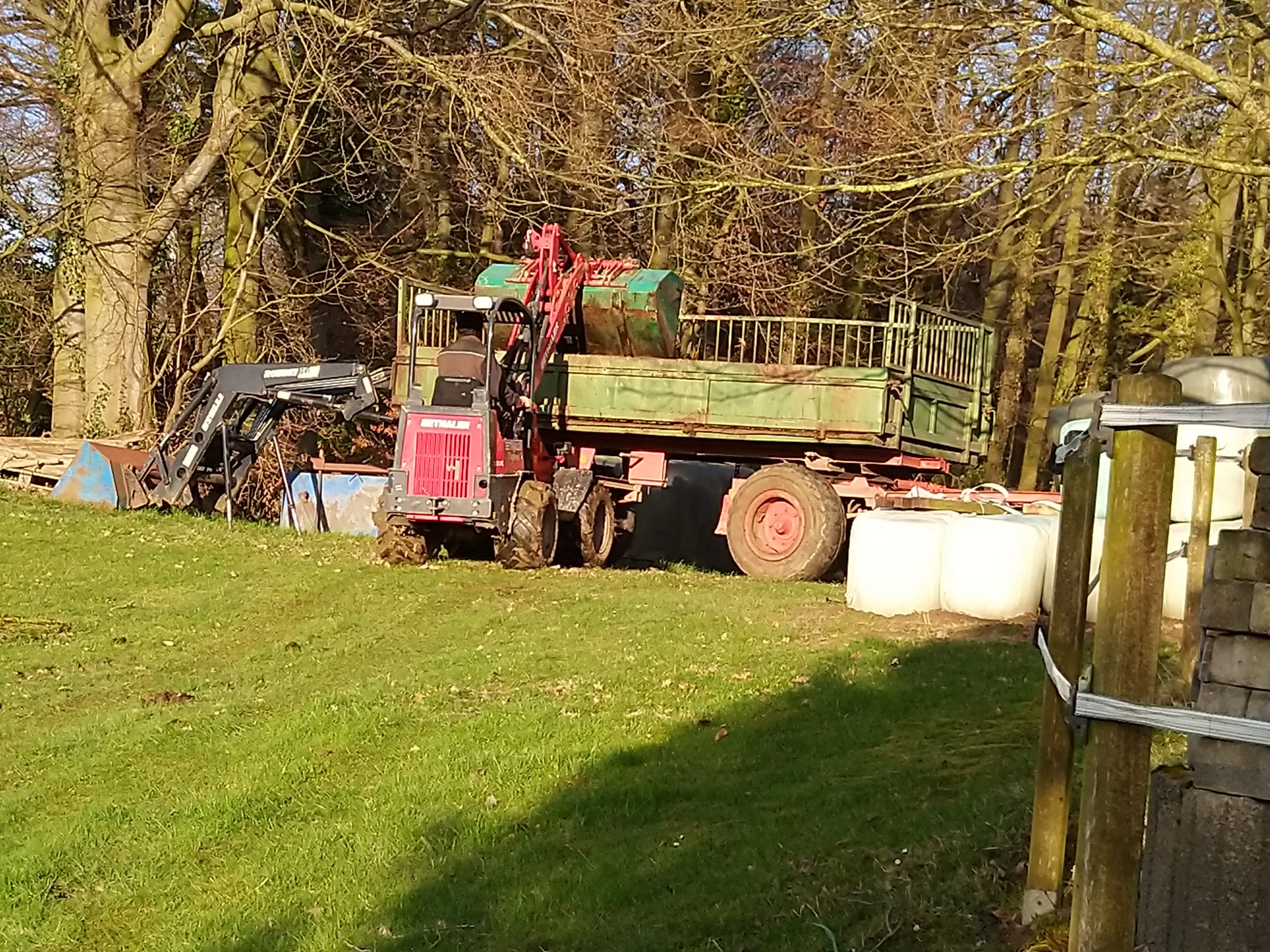 Heute habe ich den Stall gemistet – also noch mehr auf den Stapel drauf. Dann kam zu unseren Nachbarn ein Lohnunternehmer, um dort den Mist abzuholen. Die kamen mit kleinem „Hoftruck“ mit Frontlader und zwei großen Misthängern. Ich bin dann einfach mal rüber gegangen und habe gefragt, ob sie meinen Mist auch mitnehmen würden. Mein Misthaufen wurde angesehen, die Wiese erschien trocken genug für den Hoftruck, und somit sagte der nette Herr zu. Zuerst haben sie natürlich bei den Nachbarn alles abgefahren, bevor sie so gegen halb fünf zu mir kamen. Leider passte nicht alles in den großen Misthänger, aber dreiviertel meines Mists ist weg. Leider hat die Wiese um den befestigten Mistplatz doch sehr gelitten und einige Pflastersteine muss ich neu setzten, doch das ist es mir wert. Der Großteil Mist ist weg und den Schaden auf der Wiese kann ich reparieren, bzw. begradigen und mit Gras nachsähen. Nun bin ich die Sorge erstmal los.
