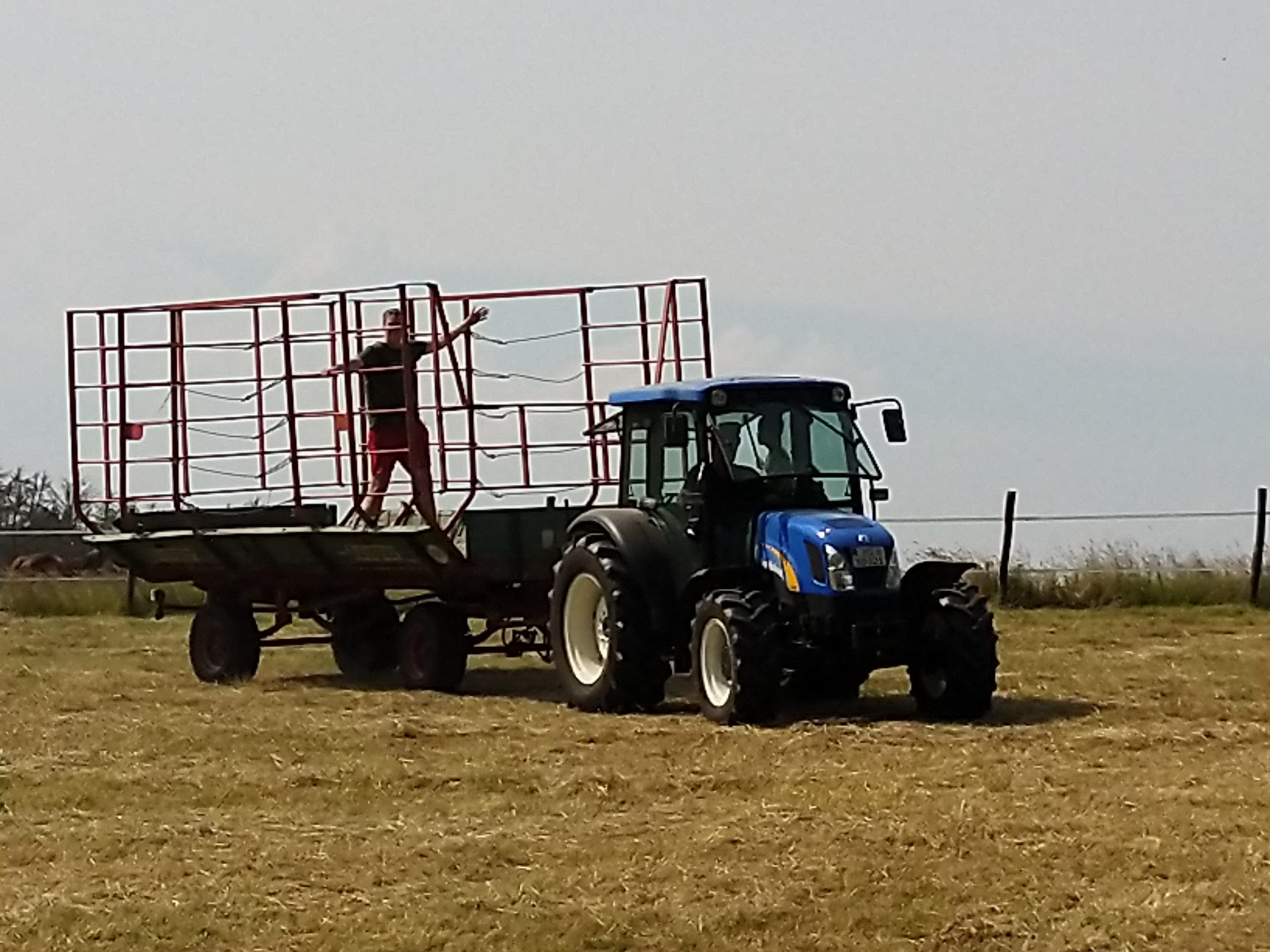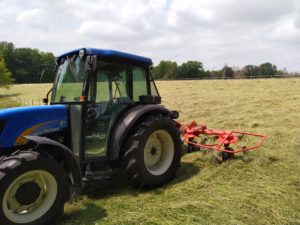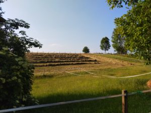 Leider kam am Dienstag Abend ein großer Regenschauer. Das hätte echt nicht sein müssen. Mittwochvormittag hatten meine Mutter und ich nun auch „endlich“ wieder einen Termin beim Friseur. Wurde langsam auch wirklich Zeit. Nachmittag habe ich wieder das Heu gewendet, aber da es den Tag über so schwülwarm war, ist es kaum durchgetrocknet. Zum Glück blieb es aber Mittwoch bis Freitag trocken und das Heu wurde noch ganz gut. Donnerstag habe ich noch etwas „umgepackt“, da wo das Gras/Heu zu dicht lag per Hand etwas ausgedünnt. Freitagabend habe ich dann in Reihen gezogen. Die Enden haben meine Mutter und ich noch etwas per Hand in Form gezogen, da unsere Wiese nicht wirklich rechteckig ist, sondern zum Wald hin etwas breiter wird, bekomme ich keine ordentlichen, gleichmäßigen Reihen hin.