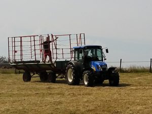 Irgendwie hat es aber doch geklappt und dann konnte ich nicht mehr viel machen, außer hoffen, dass das Wetter auch am Samstag hält und wir pressen können. Die Wettervorhersagen sahen nicht so gut aus. So war ich heute früh auch sehr nervös. Ich habe noch 10 Heuballen runtergeworfen und in der Futterkammer/Sattelkammer gestapelt. Damit war etwas mehr auf den Dachboden passt. Den Höhenförderer haben meine Mutter und ich an die Bodenluke rangiert und dann konnten wir nur noch warten und Daumendrücken. Gegen 12.30 Uhr kam unser Nachbar mit der HD-Bund-Presse und wir konnten auch die Fangwagen der Nachbarn nutzen. So brauchte niemand auf der Wiese aufstecken und auf dem Ladewagen packen.