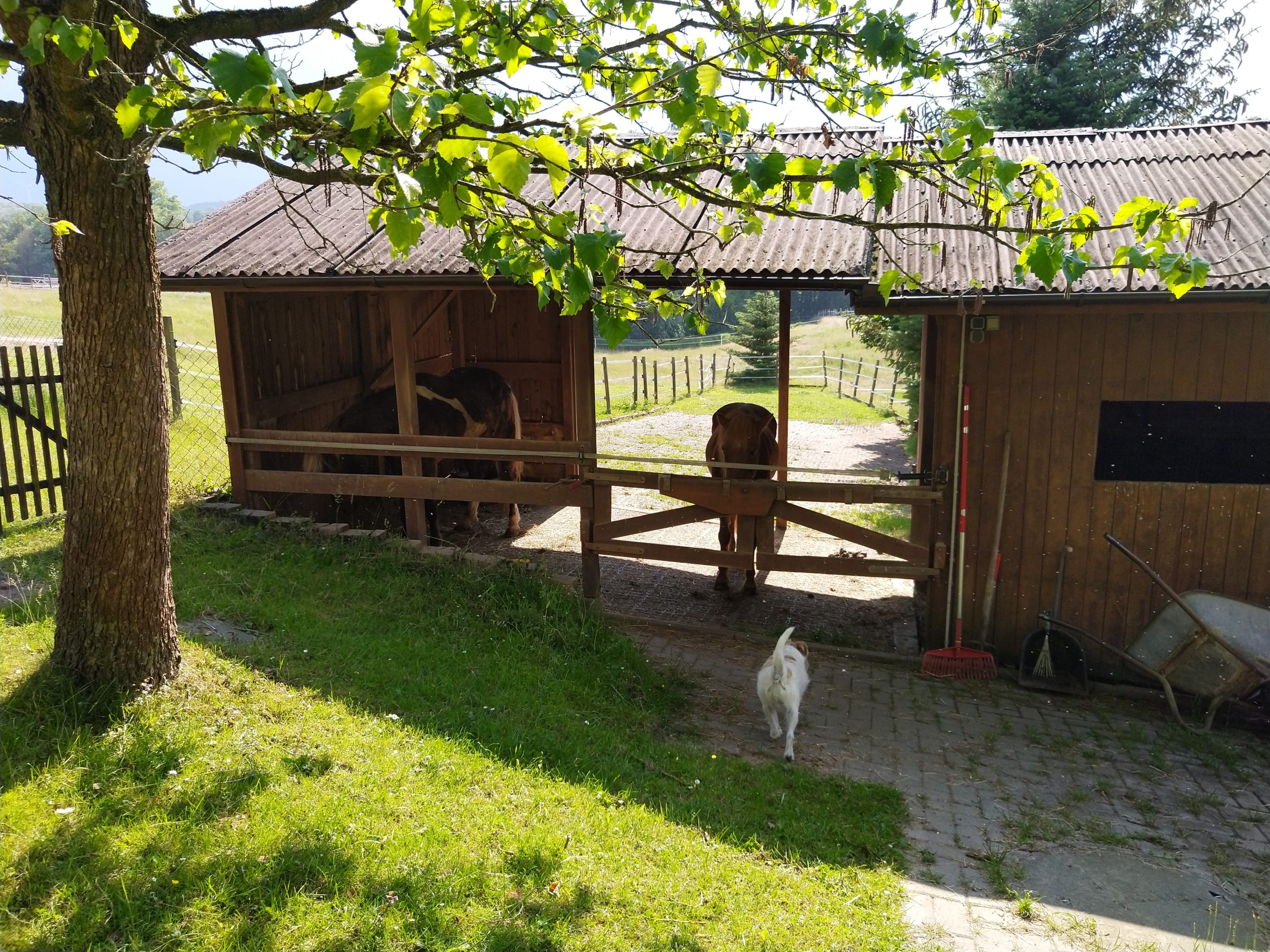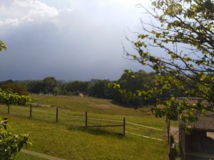 Die zwei außerplanmäßigen Helfer wollten leider nicht zum Essen bleiben, so gab es für die Familie Nudelsalat mit Heißwürstchen und/oder Fleischbällchen. Nach der Stärkung und Pause haben wir noch aufgeräumt und den Höhenförderer wieder in den Schuppen geschoben. Dann ist auch der Bruder mit Frau und Kindern heim gefahren. Als die Helfer losfuhren, grummelte es über Exter schon. Jedoch hielt das Wetter erst noch, der Regen kam so gegen 18.30 Uhr als ich gerade mit dem Füttern der Pferde fertig war.