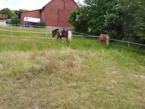 Die letzten Wochen war schon gutes Wetter. Rings um mich herum wird Heu gemacht, aber überall wo ich gucke, ist wahnsinnig wenig auf den Wiesen. Ich bekomme erst in einer Woche Urlaub und hoffe, dass das Wetter dann auch mitspielt und ich meine Wiese auch mähen kann und dass das Gras zu gutem Heu wird. Für Svandis ist überständiges Gras/Heu ja besser als frisches Gras. Samstag habe ich etwas Rasen gemäht und auch die Wiese wo Björt und Svandis jetzt fressen dürfen habe ich etwas von dem befreit, was die Damen übrig gelassen haben. Außerdem habe ich mit der Motorsense den Zaun wieder frei gemäht. Da waren unheimlich viele Brennnesseln und so komische Kletten kommen vom Nachbargrundstück rüber. Auch ein paar Äste der Baumhecke unserer Nachbarn habe ich entfernt, denn die hingen auf meinem Zaun.
