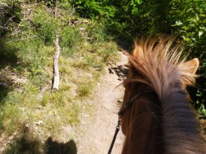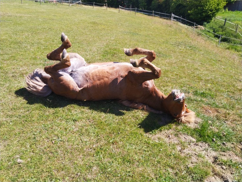 Heute früh sah ich aus dem Fenster, und entdeckte nur Svandis auf der Wiese. Keine Björt zu sehen. Zaun war heile, in den Stall kann ich wegen dem Birnbaum nicht gucken. Also angezogen und runter. Dexter musste sowieso mal Pipi machen. Björt stand im Stall und sah mich unendlich traurig an. Oh je, was hat sie bloß? Ich gab ihr ein Leckerlie, was sie auch ganz vorsichtig von meiner Hand nahm. Dabei sah ich schon, der Schneidezahn, der durch das EOTRH etwas schief stand, war noch mehr „verzogen“. Ein Halfter hatte ich nicht dabei. Trotzdem habe ich versucht an das Pferdemaul zu kommen. Björt ließ es zu, dass ich am Zahn wackel und als ich ihn zwischen Daumen und Zeigefinger hatte, und einmal geruckt habe, da war er raus aus dem Maul. Natürlich hat das zuerst arg geblutet. Björt ist auch ein paar Meter von mir weggegangen, aber dann hat sie mir doch wieder den Kopf zum Kraulen hingehalten. Nach knapp fünf Minuten hat das Bluten auch aufgehört. Im September, als die Tierärztin die Zähne bei Björt kontrolliert hat, waren noch alle Zähne fest, auch der „Wackelzahn“. Am Nachmittag bin ich dann mit Halftern zu den Pferden und habe sie auf den Hof geholt. Eigentlich wollte ich die Zahnlücke spülen und hatte mir auch Wasser und eine Spritze bereit gestellt. Doch es scheiterte mal wieder an der Mitarbeit der älteren Isländerdame. Björt war der Meinung, dass ich sie umbringen will. Steigen und austreten kann sie auch mit (fast) 25 Jahren noch toll. Hauptsache man steckt ihr nichts ins Maul. Da hilft nur ruhig bleiben und immer wieder versuchen. Ein bißchen hat es dann auch geklappt. Als ich die Zähne mit einem Frotteetuch abgerubbelt habe, das fand sie gut. Da hat sie ganz still gehalten. Anschließen bin ich mit Björt und Svandis etwas gelaufen. Die ersten Schritte bei Svandis sehen nicht so toll aus, aber als sie sich eingelaufen hatte, ging es für ihre Verhältnisse ganz gut. Wir sind aber nur ca 10 Minuten gelaufen. Eigentlich wollte ich mich wegen der blöden Kopfweh dann hinlegen, aber Björt stand am Tor und scharrte mit den Hufen. Als ich mit dem Halfter zu ihr zurück kam, ließ sie sich auch wieder ganz lieb aufhalftern und kam ohne Meckern mit. Sattel drauf und wegen der Zähne diesmal nur das Sidepull. Südweg hoch und Straße lang, das war ja noch recht entspannt. Björt ging flott voran, aber ich konnte die Zügel locker lassen. Dann sind wir in das kleine Wäldchen abgebogen. Auch dort ist der Waldboden steinhart. Alles ist trocken. Mir kommt es auch so vor, als ob die Bäume weniger Blätter haben als die Jahre zuvor. Den steilen Waldweg hoch ist Björt im Galopp hoch. Auf etwas geraderen Strecken kam ein schöner Tölt. Leider darf man auf der Vlothoer Seite nicht in den Wald der Ebenöde. Trotz Reform des Waldgesetzes 2018 wurde die Ebenöde nicht zum Reiten frei gegeben. Vernünftige Gründe dafür gibt es irgendwie nicht. Egal, Björt und ich sind die Straße lang bis zum Ex-Rütli/Ex-Bergschänke und dort den Wanderweg runter. Den Berg habe ich geführt, da es dort doch recht steil ist. Außerdem lag dort jemand auf einer Liege uns sonnte sich. Das fand Björt sehr gruselig. Nach einem viertel des Weges war der „Weg“ weg. Nur noch Büsche, Gestrüpp und Dornen. Am Feld entlang war schon ein Trapelpfad, den ich dann auch gegangen bin. Nach knapp der Hälfte des Berges konnte man wieder auf den ursprünglichen Weg gehen, aber auch dort ist es lange nicht mehr so breit wie früher. Letztes Jahr konnte man noch ganz rauf/runter auf dem eigentlichen Weg gehen. Bis zuhause habe ich geführt, da Björt und ich ja absolut keine Kondition mehr haben. Wir müssen dringend mehr gemeinsam machen Nach dem Absatteln und trockenrubbeln durfte Björt wieder auf die Wiese. Natürlich musste sie sich da noch wälzen. Ich glaube der Ausritt hat ihr gefallen. Dexter war sauer, weil ihn hatte ich nicht mitgenommen. Das wäre auch nicht so gut gewesen heute.