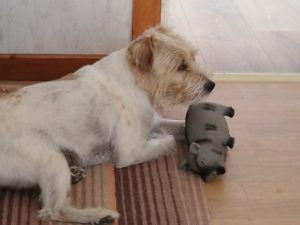 Der Kleine Mann hat zum Trost, wegen dem Pfötchen, ein kleines grunzendes Wildschwein von mir erhalten. Weil er so lieb bei der Tierärztin ist, und damit er nicht immer am Verband leckt. Ich rechnete mit einer ungefähren Wildschwein-Lebensdauer von 1-2 Tagen. Und das war schon sehr großzügig berechnet. Eigentlich sind mir die Teile auch zu teuer, weil die bei Dexter einfach nicht lange heile bleiben. Aber der kleine Mann hat sich so sehr über das Schweinchen gefreut. Statt seinem Lieblingskuscheltier hat er die letzten Tage immer das Schwein umher getragen. Der Verbandswechsel am Freitag und am Dienstag bei der Tierärztin klappte sehr gut und die Pfote ist auch schön abgeheilt.