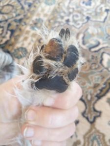 Meine Mutter und ich mussten gegen Mittag kurz weg, und als wir wieder kamen, rannte Dexter so sehr umher, das der Schuh vom Fuß rutschte. Er wollte ihn auch nicht wieder anziehen. Ich habe dann einen kleinen, wenig gepolsterten Verband angelegt. Der hat auch nur ungefähr eine Stunde gehalten. Wenn wir heute abend füttern gehen, bekommt er wieder den Schuh an. Im Haus darf er ohne Schutz laufen. Mittlerweile leckt er auch nicht mehr an der Pfote.