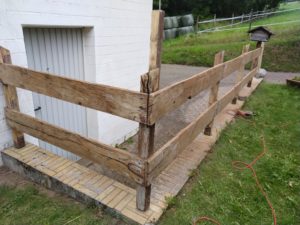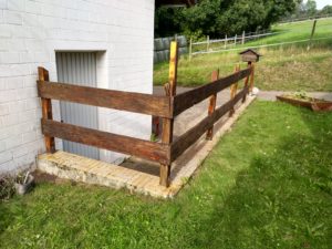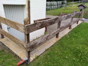 Heute habe ich dann den leicht in die Jahre gekommenen Holzzaun am Schuppen abgeschliffen. Die alte Farbe war nicht mehr schön, und die Eichenbretter schon leicht rissig an einigen Stellen. Habe es schön glatt bekommen und war recht zufrieden mit mir. Zwischendurch kam unsere Nachbarin angelaufen um mir zu sagen, dass Björt und Svandis mal wieder den Zaun nicht akzeptiert haben. Svandis hatten sie schon zurück gescheucht in die Weide, Björt stand in der Garageneinfahrt auf dem Rasen. Schnell ein Halfter genommen, Pferd gefangen, wieder in die Wiese und den Zaun mal wieder in Form gebracht. Dann weiter geschliffen. Als ich die alte Farbe und den Dreck von den Eichenbrettern entfernt hatte, kam mir der Gedanke, dass ich ja eher keine Holzschutzfarbe oder Lasur gekauft habe. Tja, … einmal mit Profis. Bin dann in den Hobbykeller. Mein Vater hat dort alles gehortet. Ich traue mich – auch nach 7 Jahren – nicht irgendwas wegzuschmeißen. So stehen dort natürlich auch ziemlich alte Farbdosen und sowas. Ich fand noch eine Dose mit Holzschutzlasur. Nach einer Schüttelprobe, ja- das ist noch flüssig. Also fix mit Pinsel und Lasur den Zaun gestrichen. Die Lasur ist auch sehr schnell eingezogen. Dexter war immer in Sichtweite und hatte einen Tennisball seines Kumpels zum spielen geholt. Ab und zu habe ich das Bällchen für ihn weggeworfen. Als der Zaun fertig war, und ich den Winkelschleifer und die Lasur wieder weggebracht hatte, da fiel mir ein, dass ich die Blumenkästen vergessen habe. Okay, das mache ich dann (vielleicht) morgen.