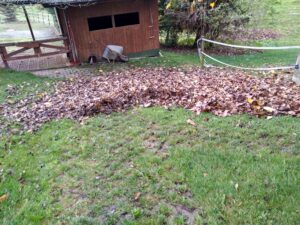 Der Herbst ist da, und das Laub fällt. Leider eben auch wieder das Laub der Bäume des Nachbarn. Die stehen auf der Böschung an unserer Hofeinfahrt entlang. Nunja, jeden Herbst das Gleiche. Pflaumen, Eicheln und das Laub der Bäume entfernen. und das nicht nur einmal. So war ich Samstag etwas über 2 Stunden damit beschäftigt, den Hof und die Wiese hinter dem Schuppen vom Laub zu befreien. Da der Birnbaum in unserem Garten und der Haselnussbaum und der Walnussbaum am Stall auch ihr Blattwerk abgeworfen haben, musste ich dort auch tätig werden.
