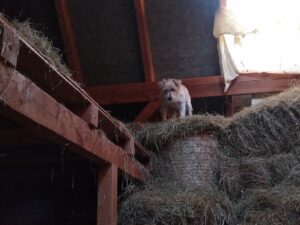 Anschließend wollte ich eigentlich die Rasengittersteine vom Offenstall zum Hof wieder vom Gras befreien, aber das war alles zu feucht, und hat nicht so funktioniert wie im Frühjahr. Stattdessen haben Dexter und ich dann auf dem Heuboden die letzten Rundballen von der Empore herunter gerollt und einen Teil ganz nach unten zum Verfüttern geworfen. Nun habe ich noch um die 100 Rundballen von 2019 und eben die Heubunde von diesem Jahr. Damit kommen Björt und Svandis auf jeden Fall gut durch den Winter.