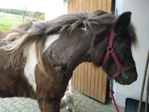 Sonntag habe ich dann bei Svandis unter der Mähne und vorn die Brust das dicke Winterfell geschoren. Sie schwitzt ohne etwas zu tun, einfach weil sie zu dichtes Fell hat, für die momentanen Temperaturen. Und da kommt ja noch einiges an Winterfell dazu. Svandis hat ganz artig still gehalten. Ich glaube, das ihr das wirklich etwas hilft. Auch bei Björt wollte ich die Brust frei scheren, aber… meine alte Dame hat da noch immer kein Vertrauen in mich. Sie steht ja immer daneben, wenn ich soetwas mit Svandis mache, dann ist ihr das auch egal. Aber wehe ich komme mit Spritze, Wurmkur, Fliegenspray oder eben der Schermaschine. Sonntag ist sie wieder des öfteren gestiegen, hat relativ gezielt nach mir oder Dexter getreten – zum Glück nicht getroffen. Immerhin konnte ich zumindest in die Nähe des Halses kommen, aber eben keine Haare entfernen. Mit dem ausgeschalteten Gerät konnte ich Björt berühren, das ist schon beinahe ein Erfolg. Natürlich werden wir weiter üben. Aber Sonntag hat es nicht geklappt. Wir haben dann noch einen Spaziergang über die Heuwiese gemacht, und Björt und Svandis durften etwas Gras knabbern.