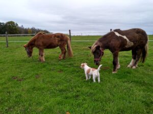 Anschließend sind Björt, Dexter und ich noch einmal schnell unsere Feldwegrunde geflitzt. Diesmal hatte ich keinen Sattel auf dem Pferd, weil für die 5 Minuten lohnt das nicht. Björt war aber „ausnahmsweise“ ganz nett und ist nicht nur gerannt. Man könnte es sogar entspannt nennen, für ihre Verhältnisse. Schnell ist sie ja immer. Als wir wieder daheim waren, bekam Dexter mal wieder Besuch von seinem großen schwarzen Freund. So oft spielen die Zwei nicht mehr miteinander, aber ab und zu besuchen sie sich. Basco bringt auch oft ein Spielzeug mit, meistens Tennisbälle 🙂